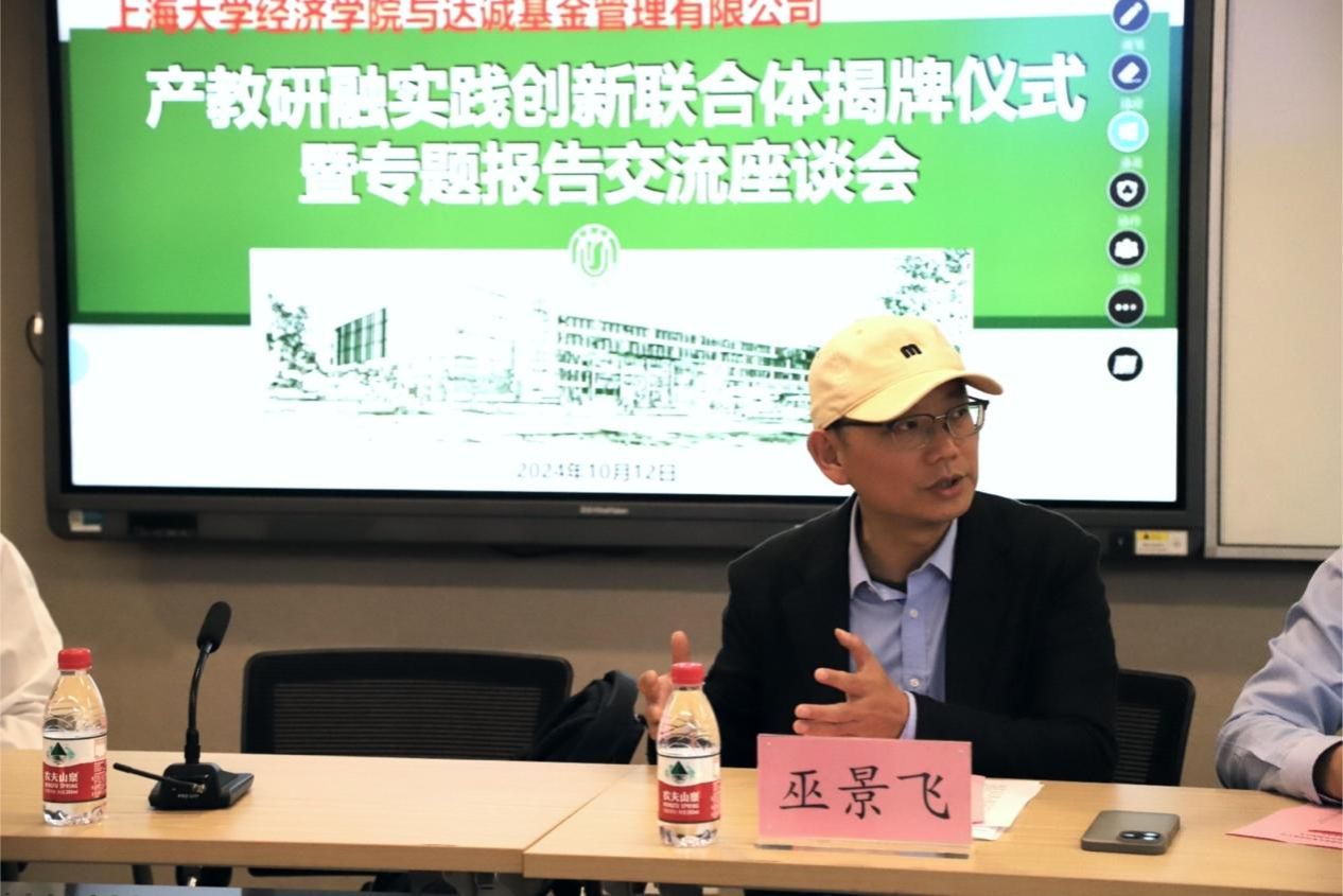 10月12日下午,上海大学经济学院与达诚基金管理有限公司产教研融实践创新联合体揭牌仪式暨专题报告交流座谈会在上海大学宝山校区经管楼580智慧教室顺利举行。本次会议由经济学院金融系副教授巫景飞主持,春华秋实教育发展协会常务理事长王大刚,FFE实习基地联盟秘书长陈斯砚,达诚基金管理有限公司首席投资官赵楠,达诚基金管理有限公司研究部总经理杨钧童,达诚基金管理有限公司信息技术部负责人陈健雄,明日金英FFE实习联盟秘书长陈斯砚等嘉宾出席本次会议。学院党委书记尹应凯,学院党委副书记、常务副院长殷凤,学院党委副书记、副院长冯玉鑫,金融系教授倪中新等老师出席。