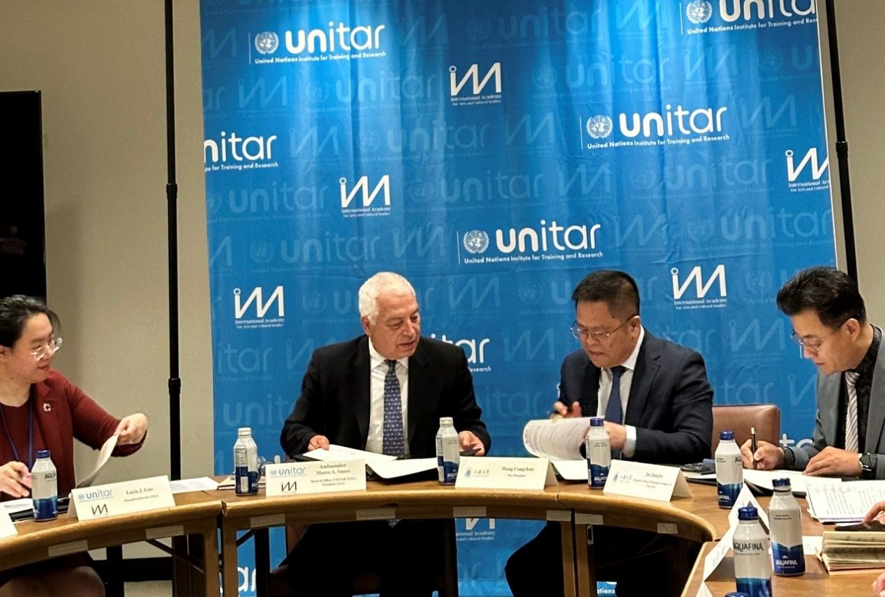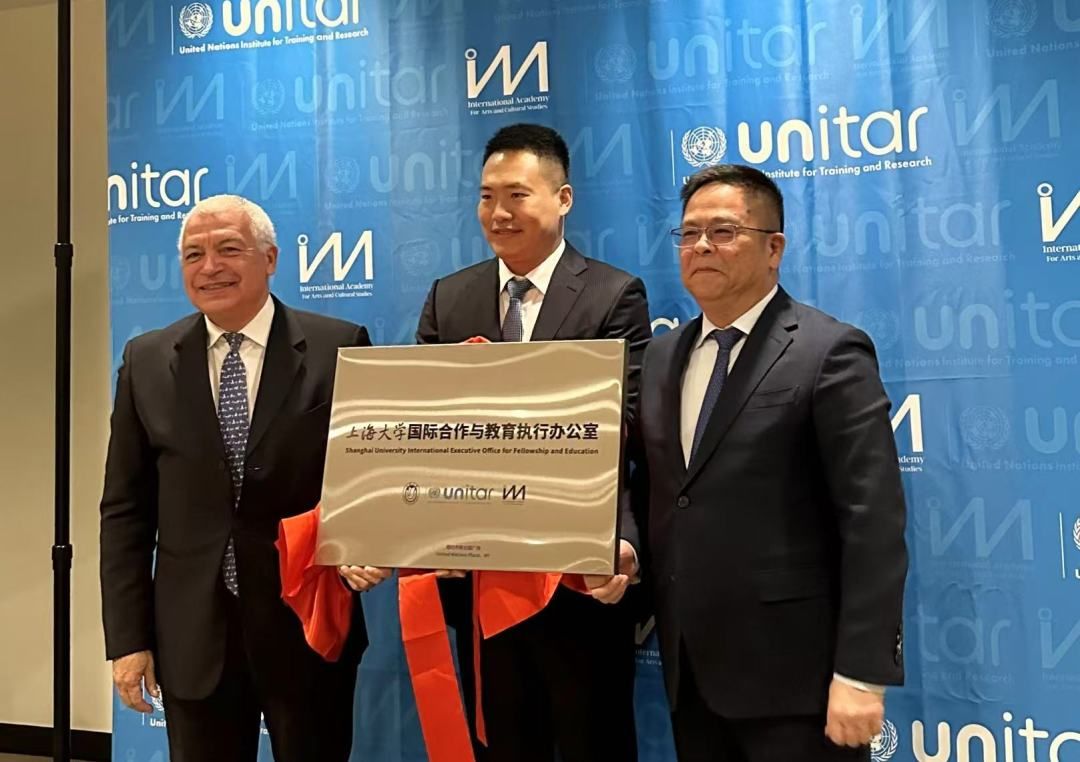 在纽约,代表团访问了联合国训练研究所及其所属的全球文化与艺术组织。王从春副校长与联合国训练研究所所长、全球文化与艺术组织主席Marco A. Suazo大使进行了会晤。双方共同签署了谅解备忘录,并为“上海大学国际合作与教育执行办公室”揭牌。双方就后续合作进行了深入交流,将共建国际文化、科技和艺术教育中心,全球城市更新与可持续发展学术智库,助力上海大学培养国际组织人才。