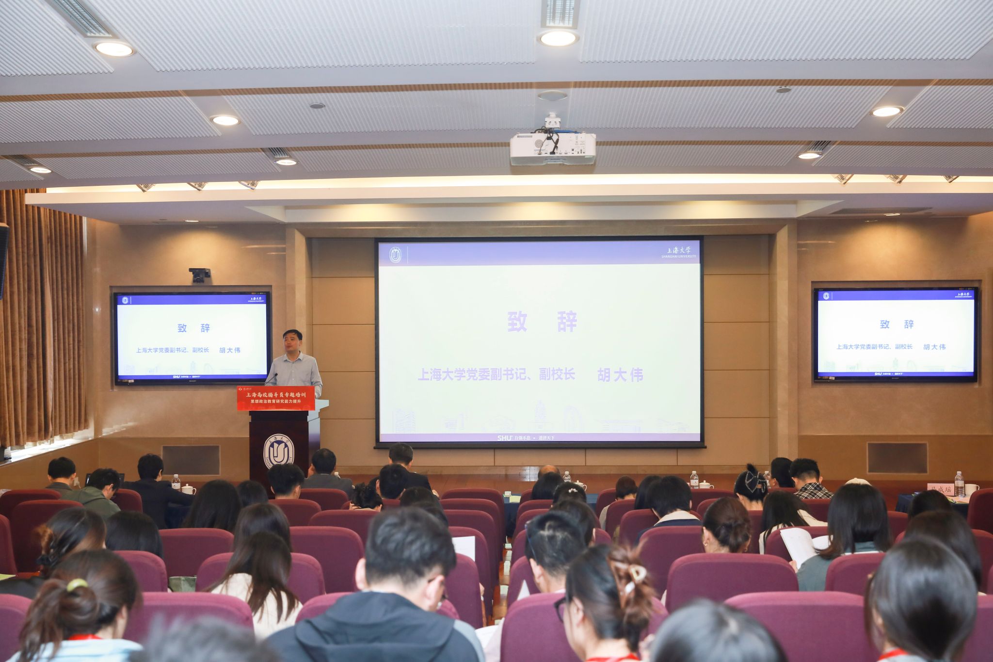 开班仪式上,基地就培训安排做了介绍,上海大学党委副书记、副校长胡大伟为培训班致辞,上海市教委德育处副处长杨长亮作开班动员讲话。