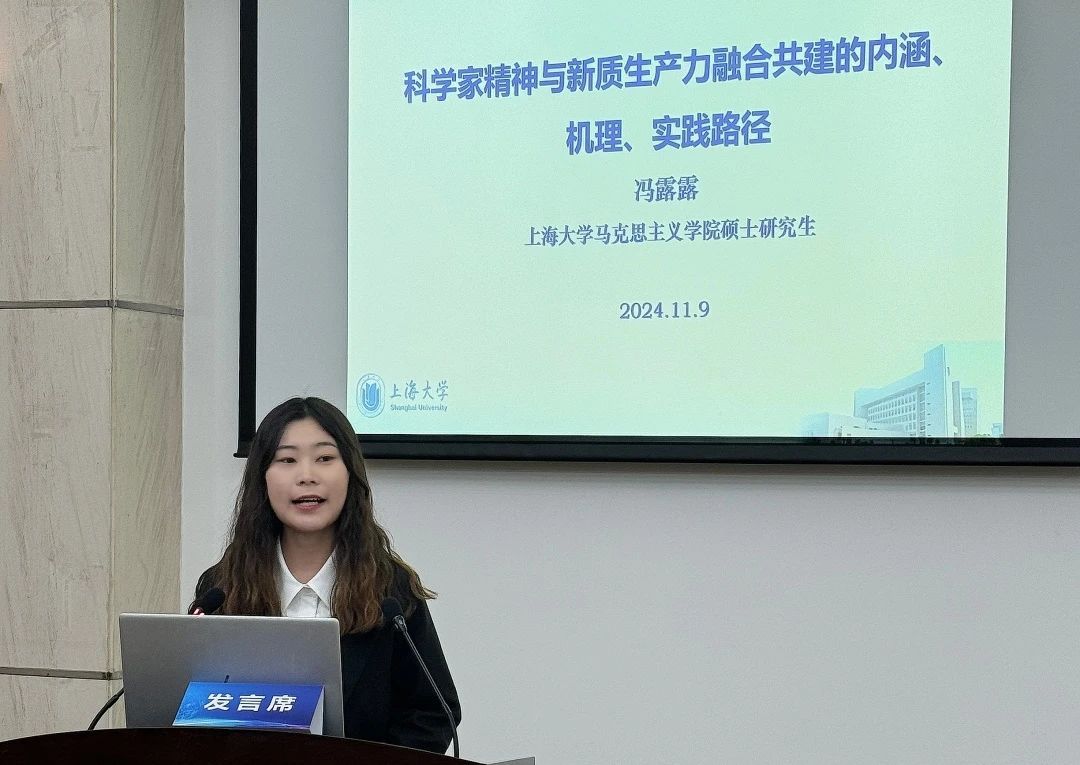 其中,“产教融合 科教融汇 加快新质生产力人才培养”分论坛在上海工程技术大学松江校区举行。论坛邀请了2024年长三角科学道德和学风建设论坛中新质生产力人才培养相关主题论文的获奖代表进行了分享。我校马克思主义学院硕士研究生冯露露进行主题为《科学家精神与新质生产力融合共建的内涵、机理、实践路径》的主旨发言。