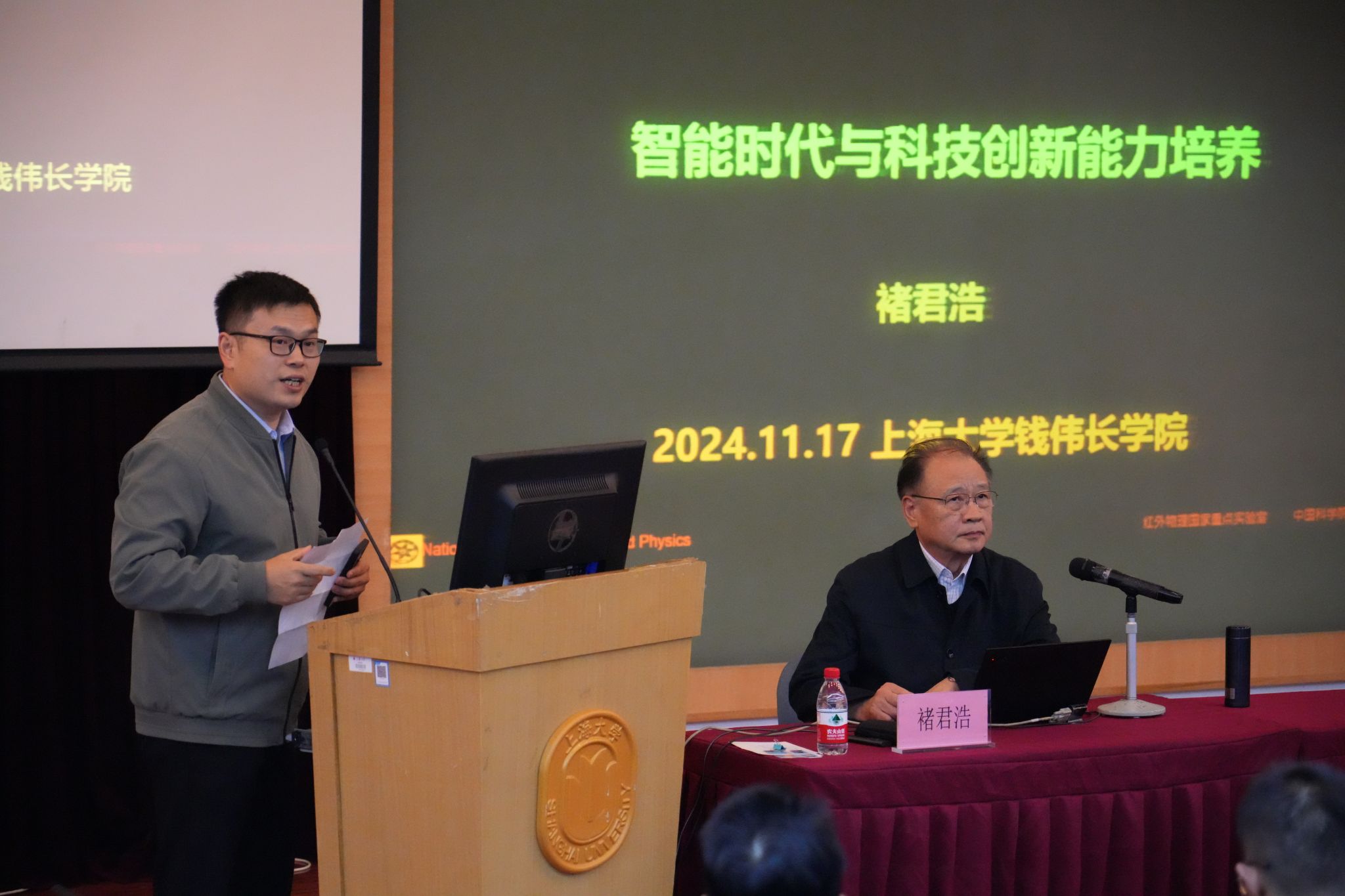 11月17日下午,上海大学钱伟长学院2024-2025学年冬季学期首日教育在宝山校区J202顺利举行。本次活动邀请到中国科学院院士褚君浩做客钱伟长讲坛,带来“智能时代与科技创新能力培养”的主题报告,讲述智能时代的发展脉络和对培养科技创新能力的深刻理解。钱伟长学院党委副书记、院长周全,钱伟长学院党委副书记、副院长沈青松,材料基因组工程研究院常务副院长任伟出席。到场的还有钱伟长学院、材料基因组工程研究院教师代表和各年级学生。活动由周全院长主持。