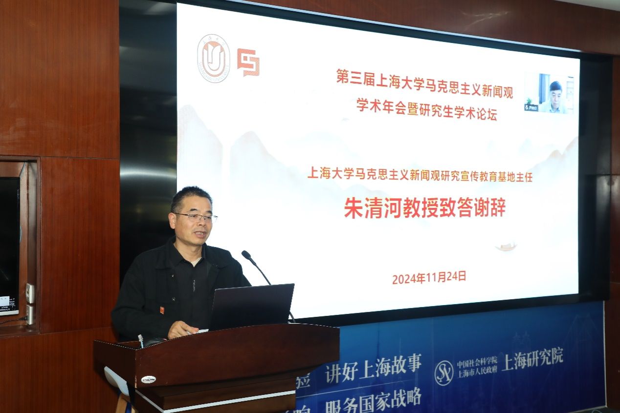 最后,由上海大学马克思主义新闻观研究宣传教育基地主任朱清河教授致答谢辞。