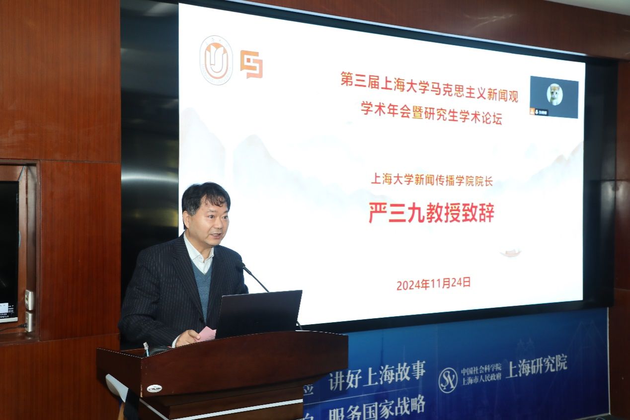 上海大学新闻传播学院院长严三九教授热烈欢迎各位与会专家学者深入探讨马新观与新闻传播实践相结合,并感谢大家为中国特色新闻传播学发展贡献智慧。