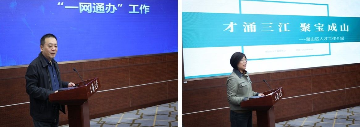 主旨发言阶段,王东分享了上海市“一网通办”的改革历程,介绍了“一网通办”如何以“业务流程革命性再造”为核心推进“一件事”改革以及“线上帮办”制度、服务“好差评”制度、“随申码”全方位应用等创新举措。钱建凤介绍了宝山区在人才工作上的重点举措和宝山科创人才港的建设,并着重探讨了宝山区与上海大学在人才服务、学生就业等方面联动合作的新机制。