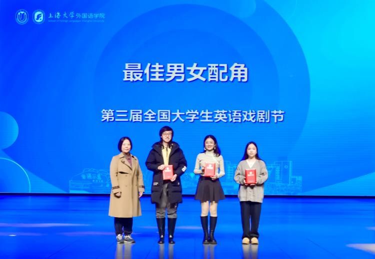 经过激烈的角逐,荣获最佳编剧奖的北京航空航天大学李英老师以其卓越的创作才华,为舞台奉献了一场令人叹为观止的叙事盛宴。山东大学刘清如、章思豫和顾璟凭借对剧本的精心改编、舞台调度的巧妙安排以及对演员表演的精准指导,荣获最佳导演奖。上海大学徐祎文荣获最佳男配角奖,汕头大学黄钰莹和武汉大学汪文琪荣获最佳女配角奖。北京航空航天大学钟浩文和上海外国语大学何诗琪分别获得最佳男主角奖和最佳女主角奖,他们凭借富有层次感的表演和出色的英语发音,成功塑造了复杂而深刻的角色,赢得了评委们的一致认可。广西大学韦乔钟、上海大学张薇和新疆大学董伊分别荣获本次戏剧节优秀指导教师奖。