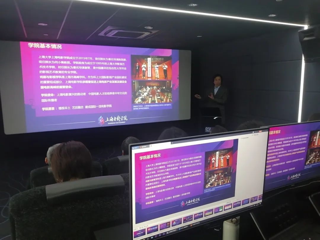 调研中,上海大学上海电影学院院长何小青围绕学院历史、专业建制、学科发展、人才培养、社会服务等方面作学院整体介绍。随后徐静副书记一行参观了上海电影特效工程技术研究中心上海电影学院党委书记丁友东等陪同参观,并为来宾详细介绍特效中心医工交叉影像实验室、老电影修复实验室、全息影像实验室、全景声声音实验室等。之后,徐静副书记一行又来到上海电影学院新大楼,参观了楼内规划建设的标准化电影院、虚拟棚以及已建设完成的摄影棚。