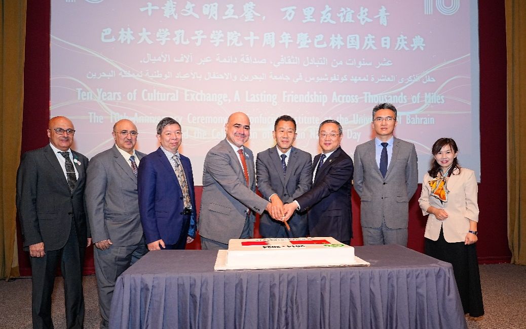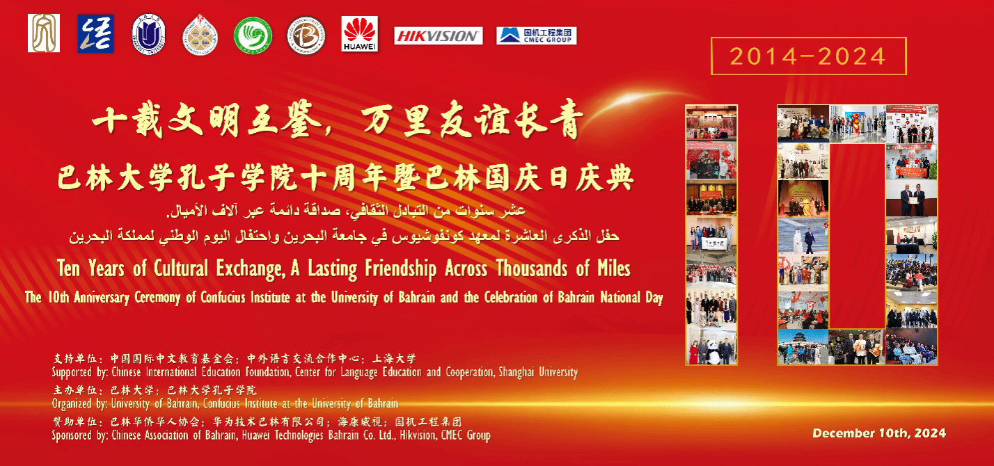 12月10日,巴林大学孔子学院十周年庆典在巴林大学隆重举行。众多领导嘉宾、师生朋友欢聚一堂,共襄盛举。中国驻巴林大使倪汝池,上海大学党委书记成旦红,巴林大学校长福阿德·穆罕默德·阿尔安萨里(Fuad Mohammed Al-Ansari),巴林大学副校长兼孔子学院外方院长默罕默德·雷达·卡德尔(Mohammed Redha Qader),上海大学党委常委、宣传部部长曾军,国际部党委书记王丽娜,人才工作办公室主任姜颖,孔子学院办公室主任徐晓红,孔子学院中方院长周建,以及来自上海大学和巴林大学相关院系代表共同出席本次庆典。巴林中资机构代表、巴林孔院师生以及巴林社会各界友人也共同见证本次盛会。