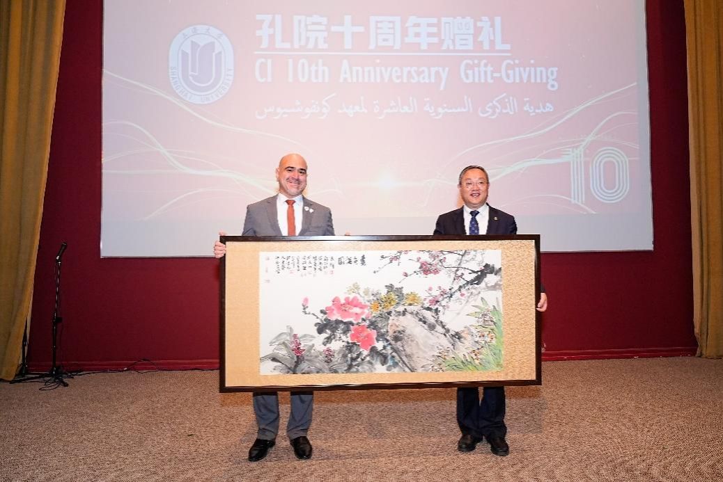 十年情谊满满,上海大学与巴林大学互赠了国画和铭牌,象征两校之间坚定而绵长的友谊与合作。