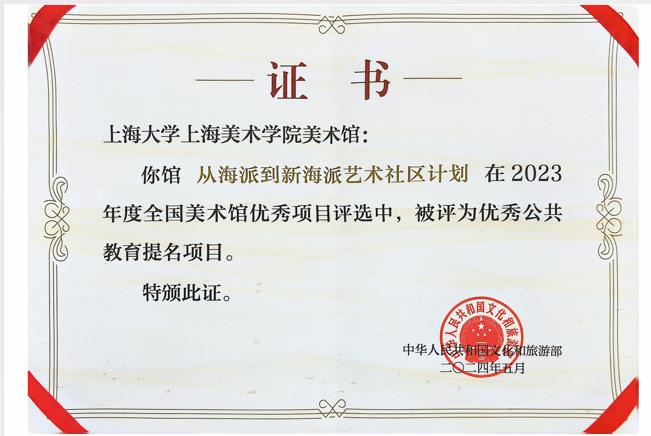 上海美术学院美术馆近年来依托学院的学术背景和研究能力,尤其是在海派文化、近现代美术文献研究及当代艺术探索方面,形成了独特的学术优势——以“新海派”为核心研究与展示主题,充分利用上海作为海派文化发源地的资源优势和上海的地域文化优势,系统探讨海派艺术的历史与当代意义,打造独特的艺术叙事。以“新海派”为主题的系列围绕展览和藏品展开的学术研讨,呈现了上海美术学院新时代以来优化培养模型、重建师资梯队,积极参与上海城市国际化发展的成果。“从海派到新海派艺术社区计划”公共教育项目荣获文化和旅游部艺术司公布的2023年度全国美术馆优秀公共教育提名项目评选。