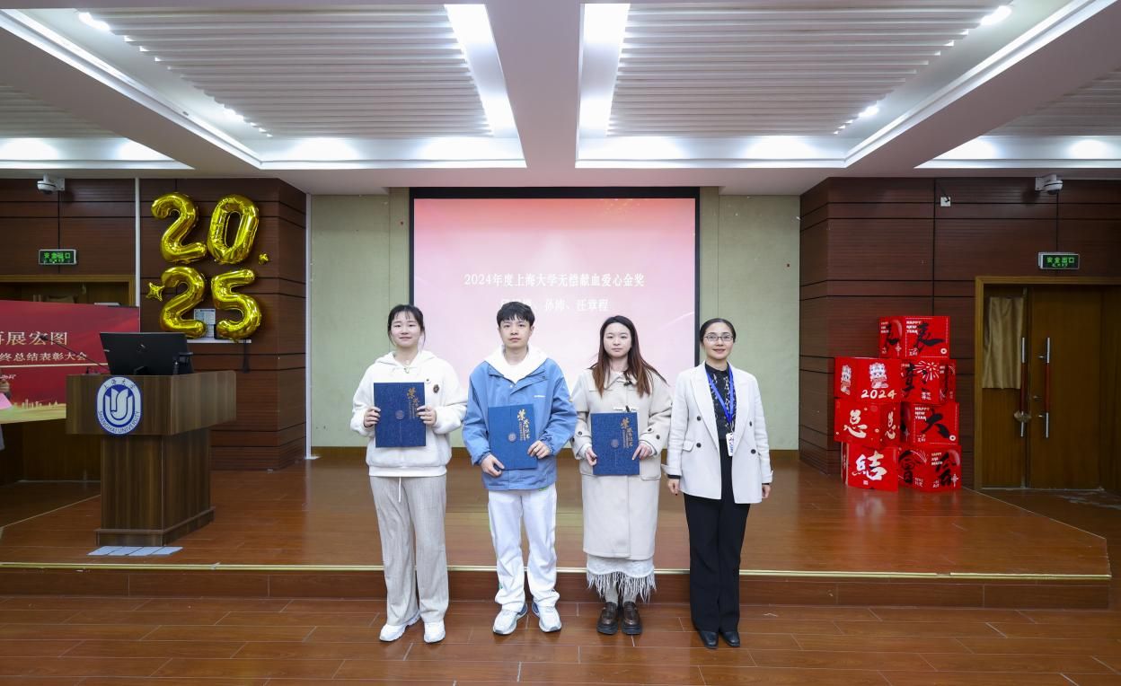 随后表彰了2024年度上海大学无偿献血爱心金奖获得者邱爔爔、孙沛、汪章程。由党委研究生工作部部长魏宏为他们颁奖。