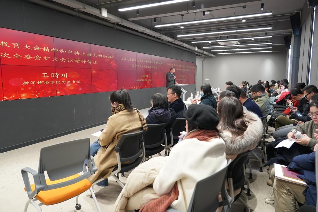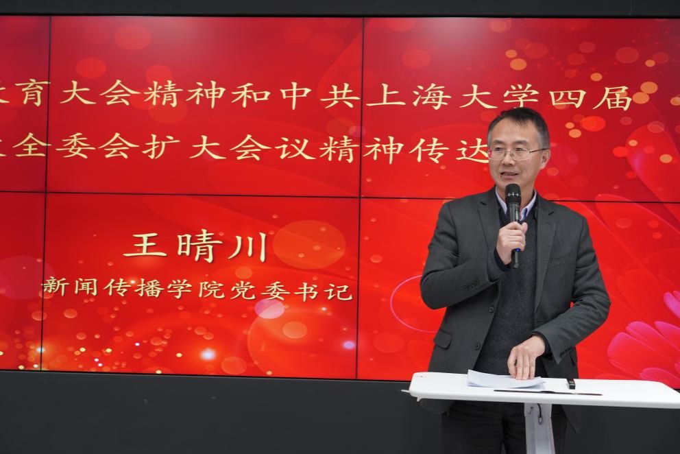 会议伊始,学院党委书记王晴川向全体与会人员传达了近日召开的上海大学教育大会、中共上海大学第四届委员会第二次全体(扩大)会议、上海大学教育教学改革专题会议精神。王晴川书记指出,学校近期召开的这三次重要会议,涵盖上海大学人才培养、党的建设和综合改革等核心议题,新闻传播学院要认真学习贯彻落实,积极参与和推进学校的教育教学改革,认真落实“谋划”、“改革”、“攻坚”这三个关键词,奋力推进学院在2025年取得大进步和大发展。