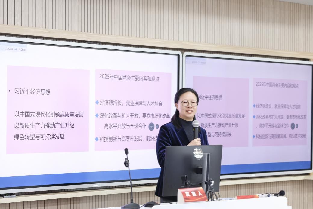 上海市课程思政示范课程负责人、悉尼工商学院党委书记吕康娟分享了学习习近平经济思想的感悟。她认为,关注两会最新精神,务必要讲清中国式现代化引领高质量发展、新质生产力以及绿色转型和可持续发展三大关键要点。吕书记介绍了悉尼工商学院在课程思政建设方面的整体思路。她以“管理与组织”课程建设为例,讲述通过重构传统课程、参与教材编写、开展学术论坛、组织企业调研等方式,形成合力,将习近平经济思想深度融入经管类课程教学的具体做法。