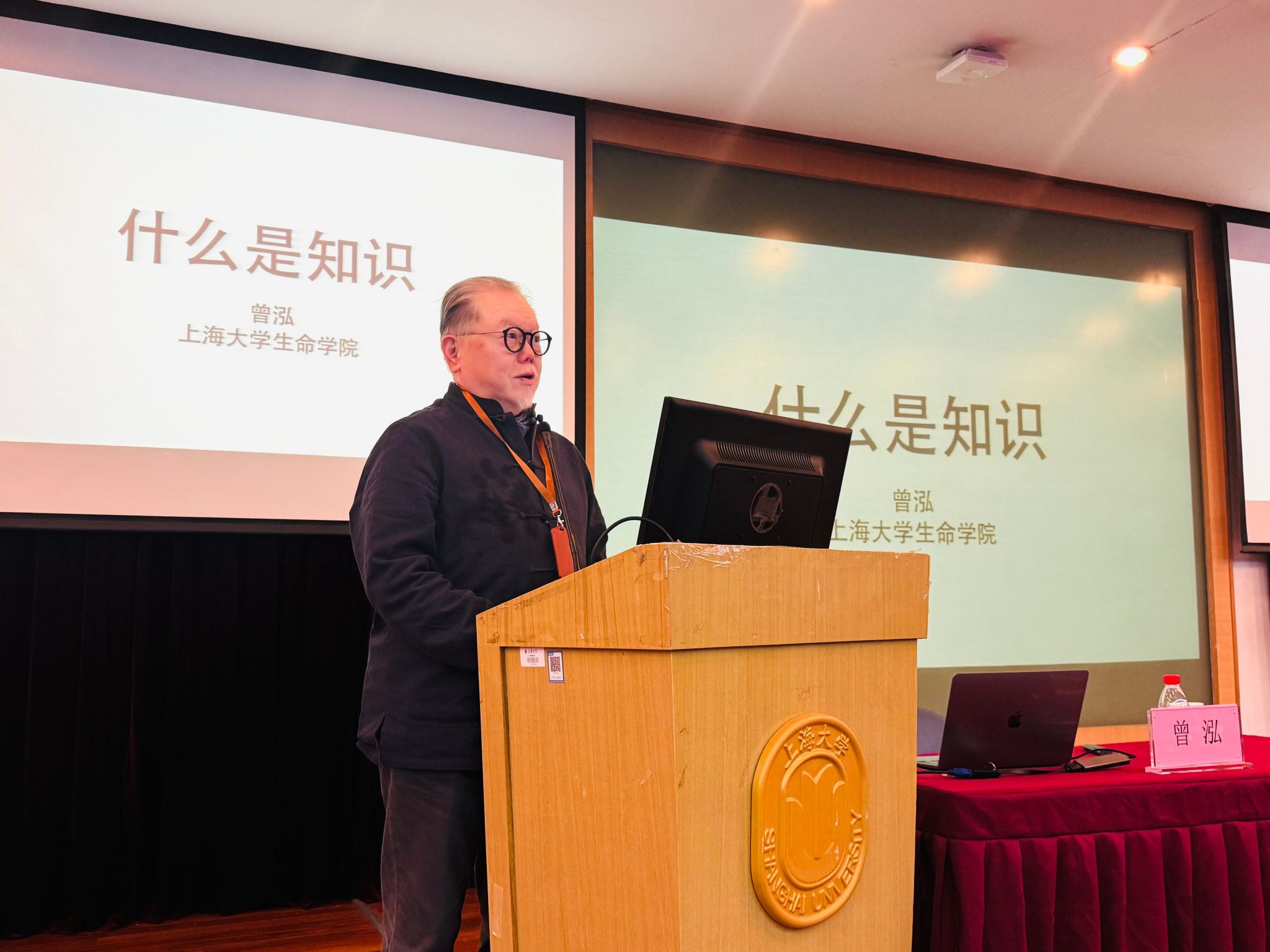 首日教育的第一部分由上海大学特聘教授曾泓应邀作《什么是知识》主题讲座。周全院长主持并介绍了曾泓教授。曾泓教授曾任职于美国国家卫生研究院(NIH),在关节炎肌肉骨骼及皮肤疾病研究所(NIAMS)担任医学卫生科学主管,他的研究涉及分子生物学、细胞生物学、知识计量学和科学哲学等多个领域。讲座从知识的基本定义和性质入手,阐释知识对拥有者意味着什么,并从神经生物研究的专业视角,分析人类知识的巨大描绘能力。讲座深入浅出,启示同学认识知识、追寻知识,为同学们接下来的研究和学习提供了新的方法论。讲座结束后,曾教授与师生们展开了热烈的互动讨论,对同学们的踊跃提问给予了耐心解答。此次讲座帮助同学们对知识和科学的基本概念有了更加深入和系统的理解。