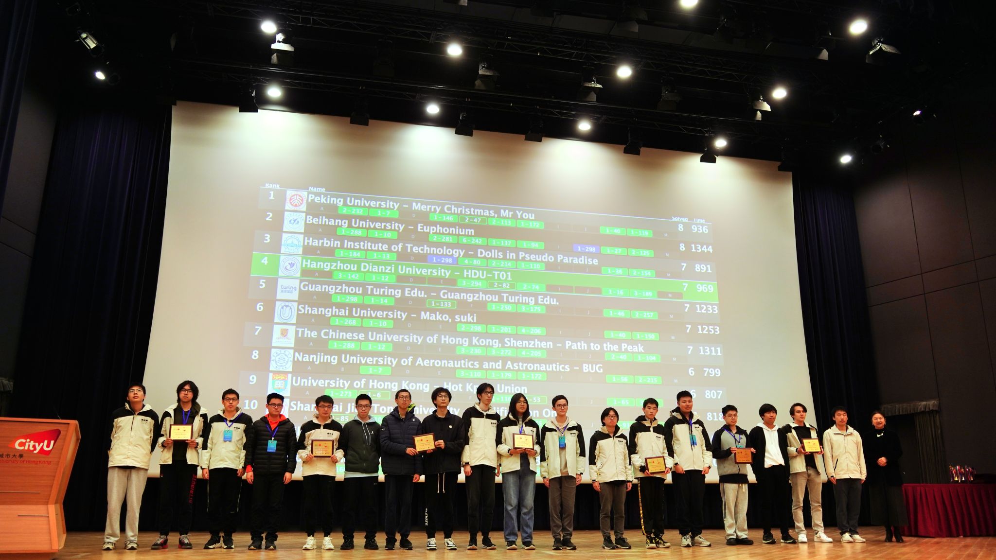 比赛不仅过程紧张刺激,赛场外的点滴同样精彩纷呈。滚榜阶段,我们怀揣着紧张与期待,紧紧盯着榜单。当看到电子科技大学的罚时高于我们时,那份喜悦瞬间爆发,兴奋之情溢于言表。赛后,企业宣讲会让我们提前接触到行业前沿,晚宴上与来自不同高校的优秀学子畅聊,无论是比赛经验还是生活趣事,都让我们收获满满。同时,主办方的用心细致也让人倍感温暖,随处可见热情服务的志愿者,赛时充足供应的食物和矿泉水,都彰显着他们的专业与关怀。能代表上海大学参与如此盛大的赛事,心中满是幸运与自豪。