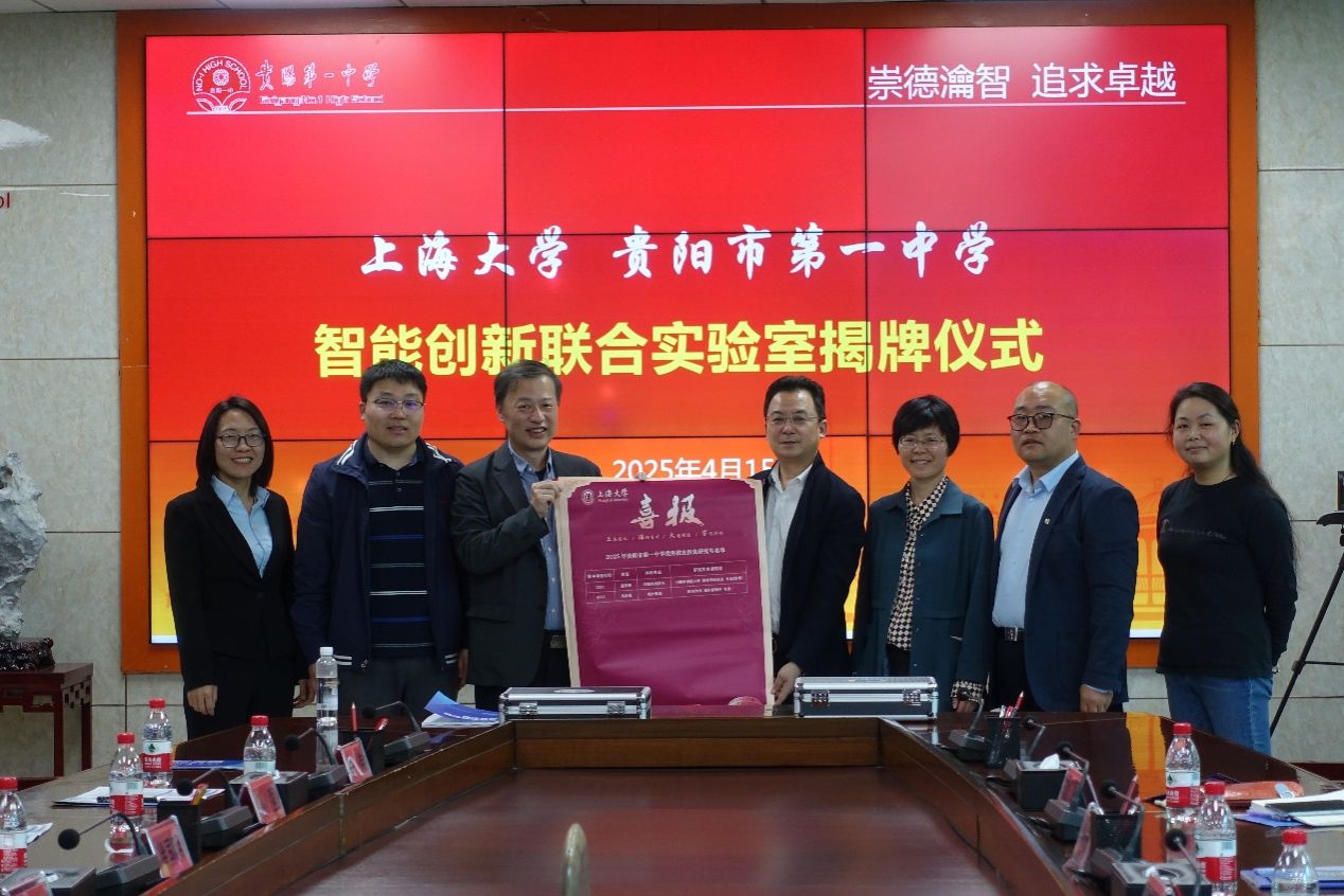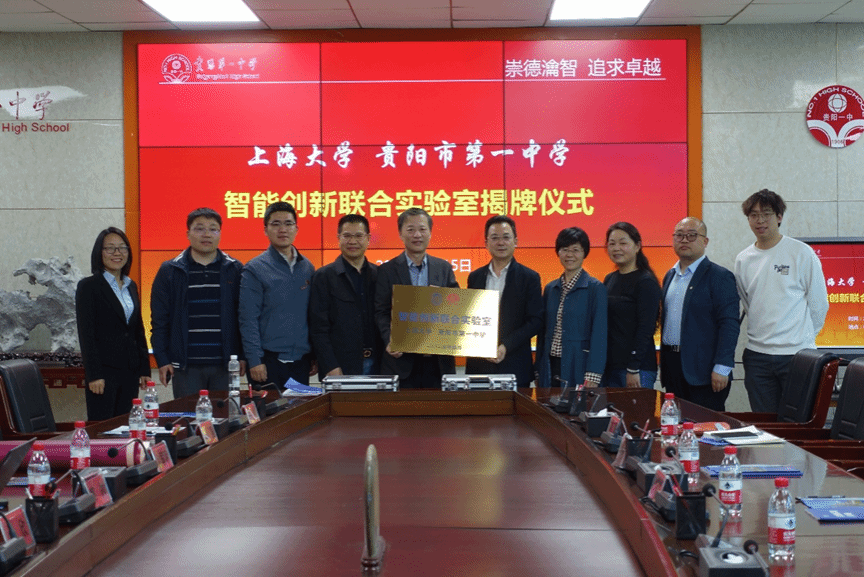 揭牌仪式上,与会双方就创新人才培养、大中小学衔接和实验室的运行机制、下一步的合作方式等进行了深入热烈的沟通交流。贵州招宣组(法学院)向贵阳一中领导送上喜报,充分呈现贵阳一中学子在上海大学取得的各方面成绩。随后,双方共同为智能创新联合实验室揭牌,标志着上海大学与贵阳一中在接续培养科技创新人才探索上又迈出了新的步伐。