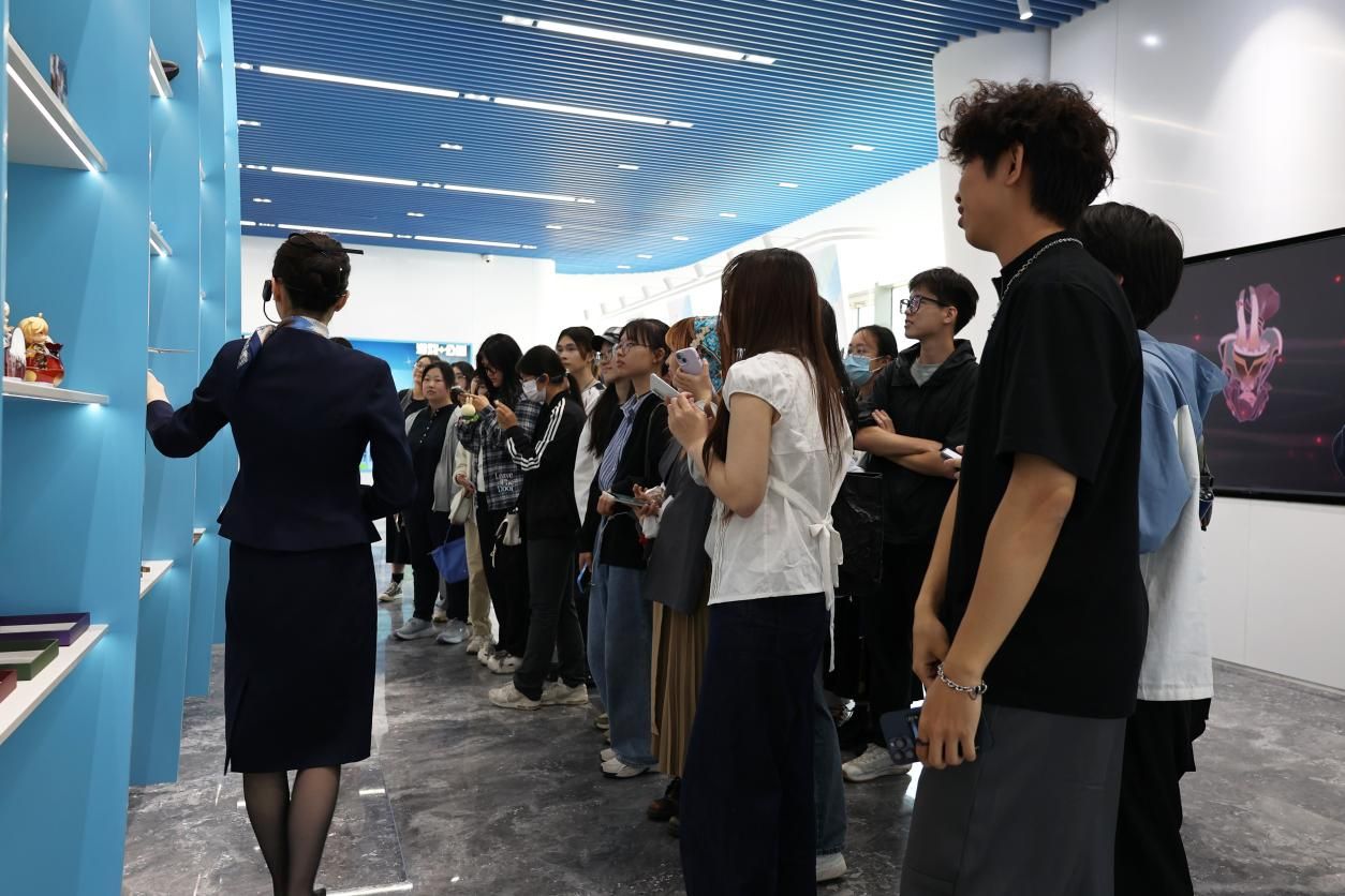 在米哈游英业达园区内,人力资源部的员工热情地接待了师生们。在讲解员的指引下,师生来到一楼展厅进行参观。讲解员为大家详细介绍了米哈游的发展历程及创办理念,通过不同展区的内容为大家讲述了米哈游的曾获奖项、硬核技术,在文化传承和文化传播方面做出的努力以及为公益事业做出的贡献等。通过文创和科创的双重驱动,米哈游的游戏得以赢得众多玩家的喜爱。参观过程中,同学们对于游戏周边的展区怀有极高的热情,纷纷上前拍照留念。
