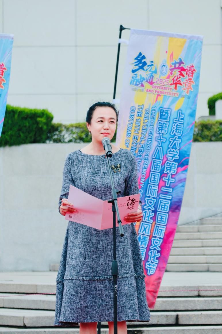 上海大学副校长于雪梅致辞并宣布文化节开幕。她在致辞中介绍了2025年上海大学国际文化节主题“多元融通 共谱华章”所蕴含的美好寓意,强调学校将持续深化国际合作,勇攀国际化办学新高峰,为建设具有全球影响力的高水平大学注入澎湃动力。