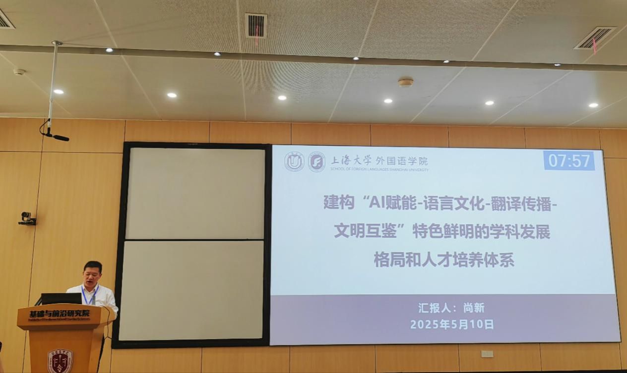在专题汇报环节,尚新院长系统介绍了学院的学科建设成果和发展规划。他指出,学院始终秉持“中国灵魂、全球视野”的人才培养理念,积极探索“外语+中华/海派文化+信息技术+国际传播”的学科融合发展新路径。学院重点建设外国语言学及应用语言学、外国文学与比较文学、翻译与国际传播、国别与区域研究四个学科方向,已形成显著特色。