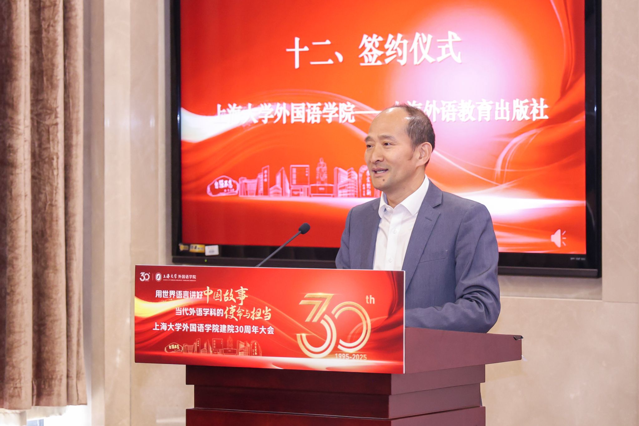 上海交通大学外国语学院院长尚必武教授作为学科专家代表发言。他首先对学院建院三十周年表示热烈祝贺,并表示,在当今全球化进程加速的时代背景下,外语学科的发展至关重要,上海大学外国语学院凭借其独特的学科优势和深厚的学术底蕴,在培养高素质外语人才、推动外语学术研究等方面发挥了重要作用。