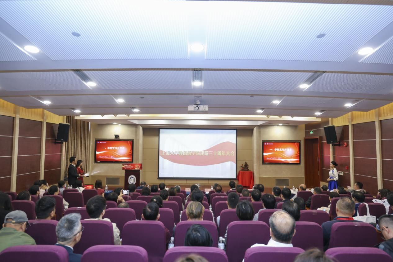 峥嵘岁月三十载,砥砺奋进新时代。5月18日上午,上海大学外国语学院建院30周年大会在乐乎新楼学海厅顺利举行。上海大学党委书记成旦红,上海大学外国语学院荣休教授方梦之教授,国务院学位委员会外国语言文学学科评议组召集人、上海市外文学会会长、上海外国语大学原副校长查明建教授,第十三届、十四届全国政协常委、原西安外国语大学校长户思社教授,第七届国务院学位委员会外国语言文学学科评议组成员、北京外国语大学讲席教授王克非教授,清华大学二级教授、广西大学君武讲席教授、中国英汉语比较研究会专家委员会主任委员罗选民教授,上海兄弟高校外国语学院院长,共建合作单位代表,学校职能部处及兄弟学院领导,学院老领导,校友分会理事,海内外校友代表,学院党政领导班子,师生代表等出席大会。大会由外国语学院青年教师张梦瑶和硕士研究生李峥赫主持。