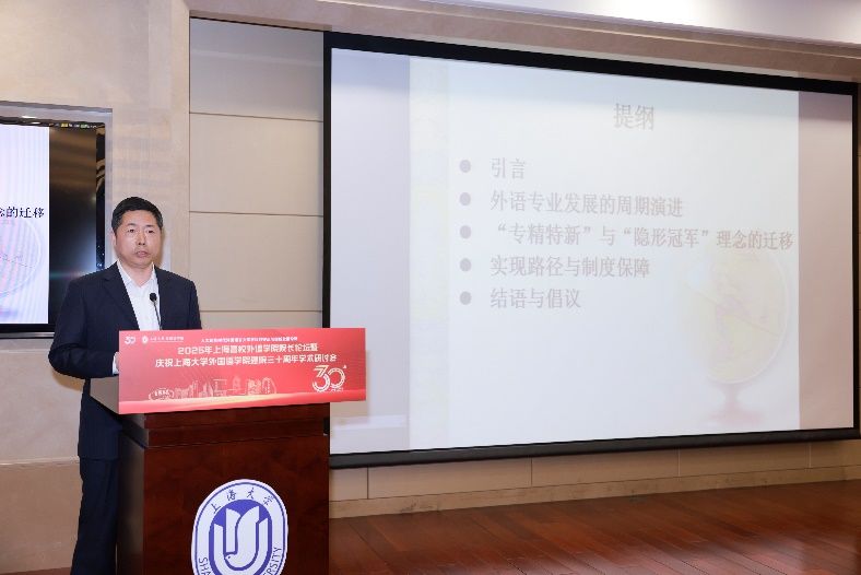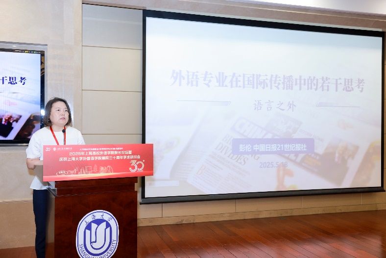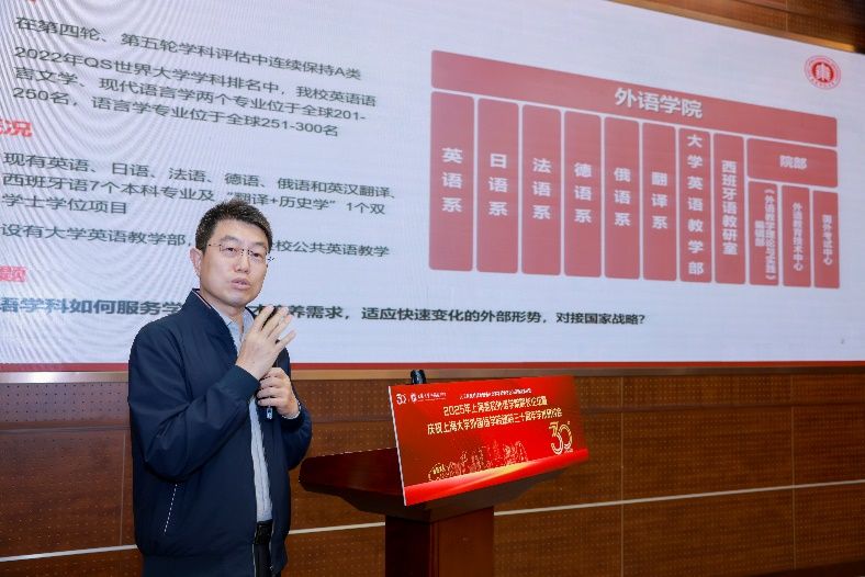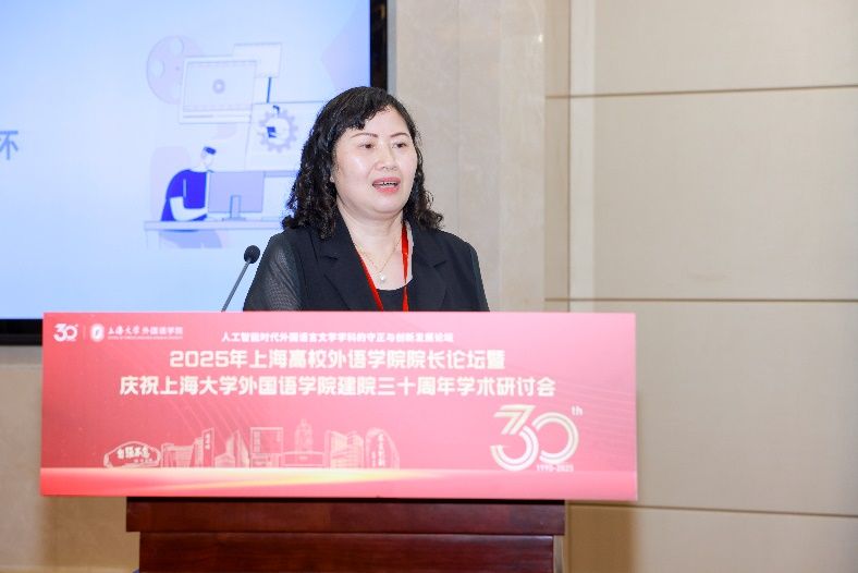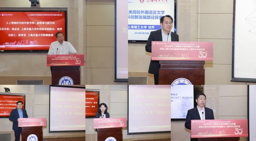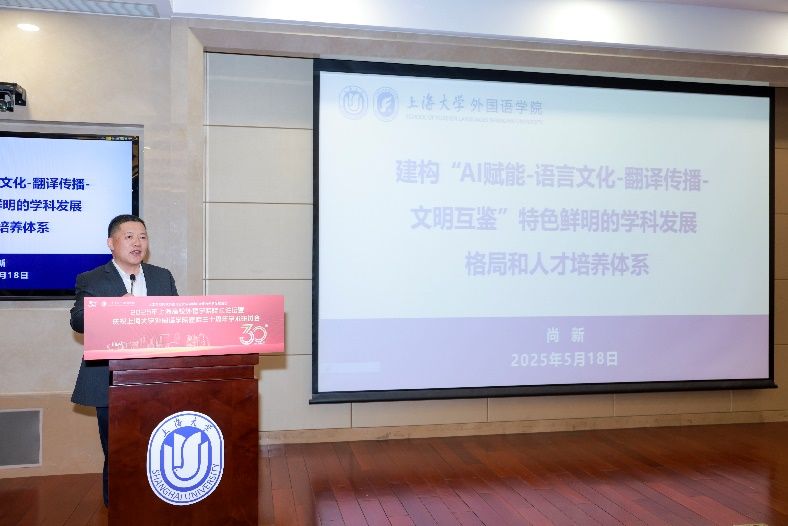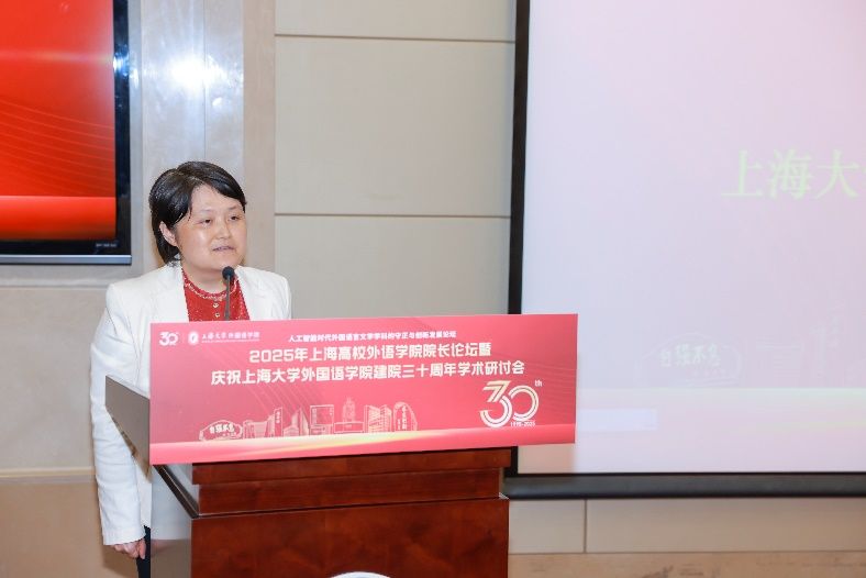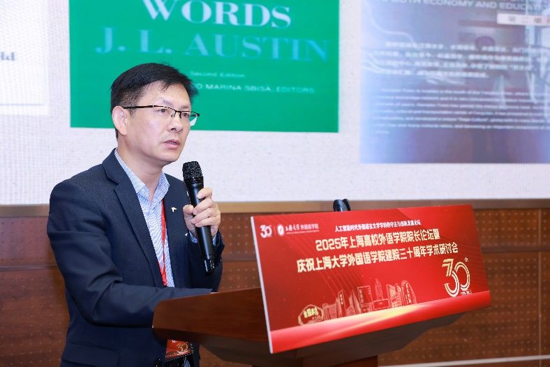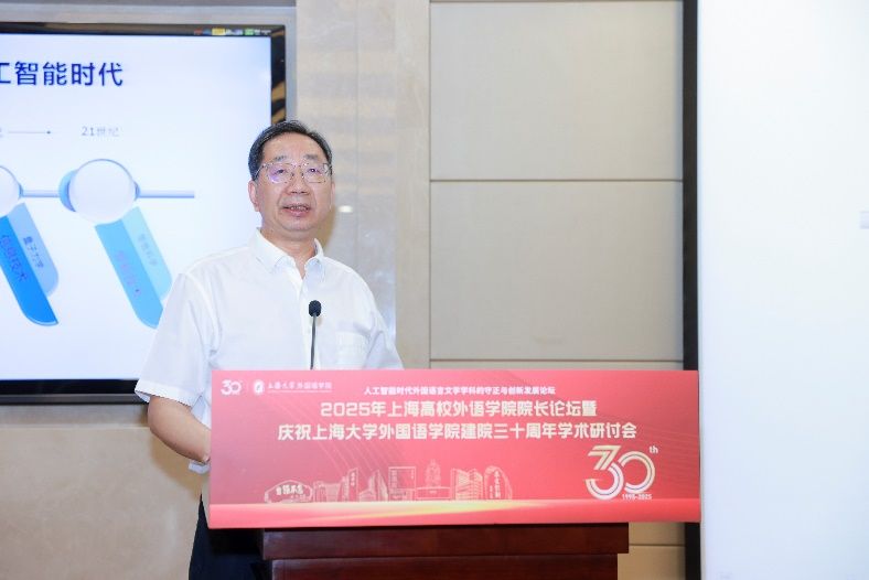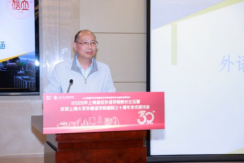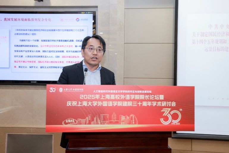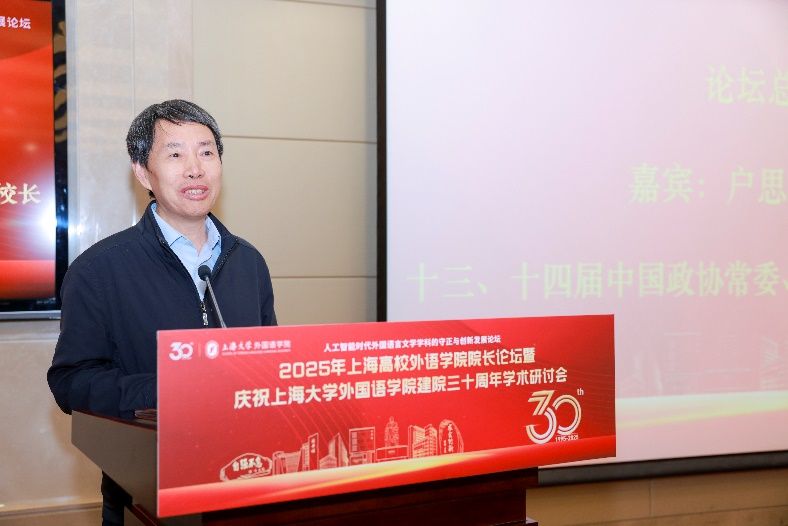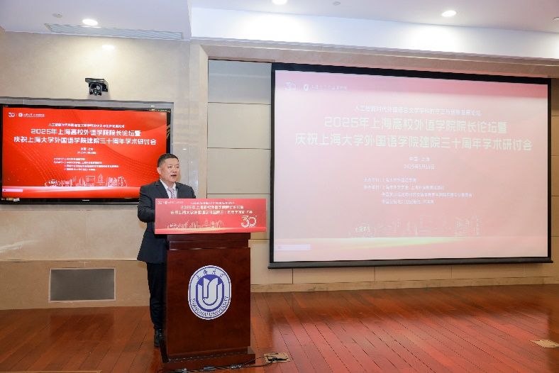 5月18日下午,由上海大学外国语学院主办,由上海市外文学会、上海外语教育出版社、中国英汉语比较研究会语言教育与国际传播专业委员会、中国日报社21世纪报社、环球网协办的“人工智能时代外国语言文学学科的守正与创新发展论坛”——2025年上海高校外语学院院长论坛暨上海大学外国语学院建院三十周年学术研讨会在上海大学宝山校区乐乎新楼学海厅举行。本次论坛邀请到来自上海20余所公办高校外语学院的院长、专家学者、行业代表共同研讨人工智能时代外语学科面临的机遇与挑战,共谋高校外语学院发展的愿景,为构建人类命运共同体、推进中外人文交流和文明互鉴贡献外语学科的智慧和力量。