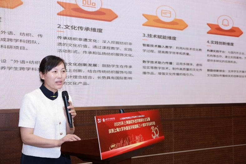东华大学外语学院执行院长张曦副教授具体介绍了该校通过构建“学科交叉—文化传承—技术赋能”三维协同机制,实现外语人才培养从语言能力向跨文化传播能力的范式转型,阐述了如何依托纺织学科特色形成“专业内容+文化内涵+传播技术”融合模式,有效提升国际传播的深度与广度,为外语学科服务国家战略提供实践范式的参考。
