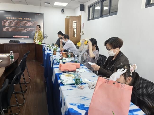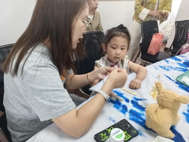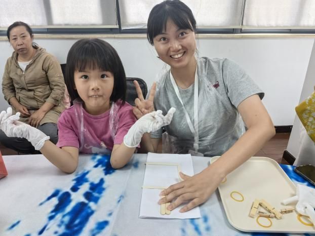 活动现场,首先映入眼帘的是非遗扎染体验区。在臻遗宝阁非遗工作室老师的悉心指导下,教职工和孩子们一同动手,将一块块洁白的手帕通过折叠、捆扎、染色等工序,赋予了它们独一无二的色彩与图案。大家充分发挥自己的想象力,或扎出精致的小花形状,或捆出抽象的几何图形,每一个作品都饱含着创作者的巧思。经过一段时间的等待,当手帕被打开的那一刻,绚丽的色彩和独特的纹理让现场充满了惊喜的赞叹声。孩子们兴奋地向父母展示着自己的成果,家长们也为孩子的创意和动手能力感到骄傲,现场洋溢着浓浓的亲子情。