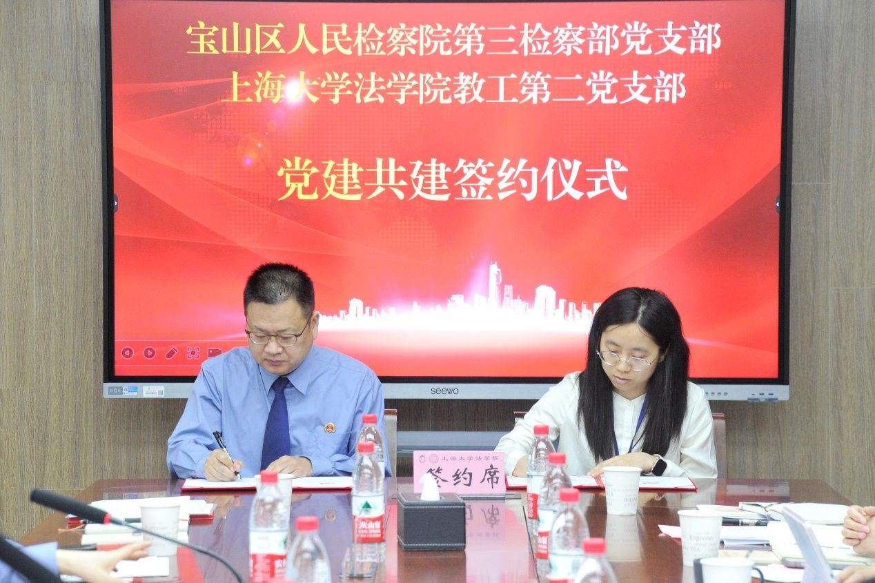 宝山区人民检察院第三检察部党支部与上海大学法学院教工第二党支部签订党建共建协议。