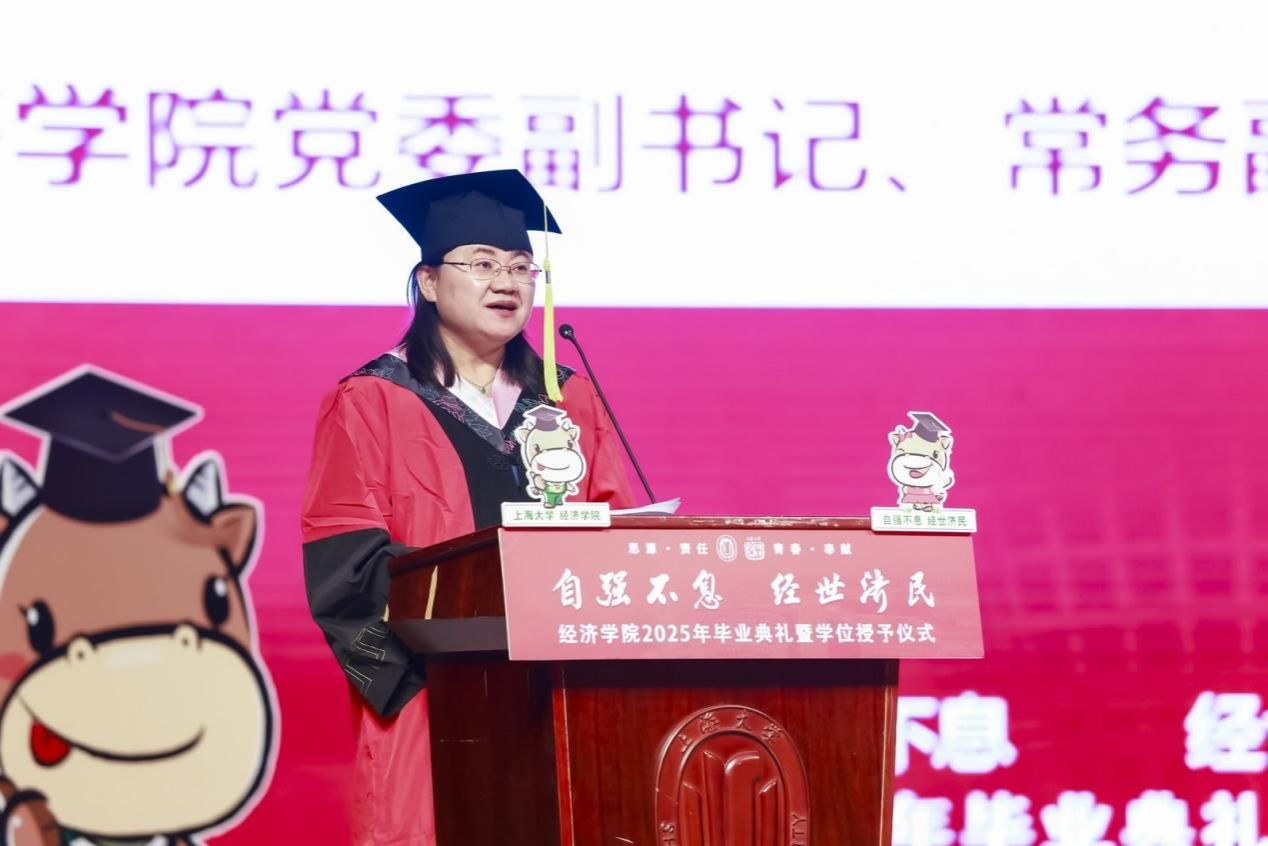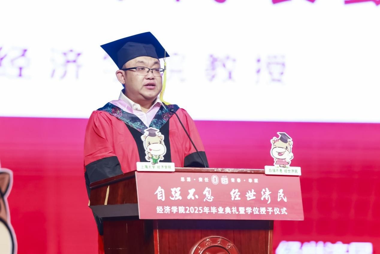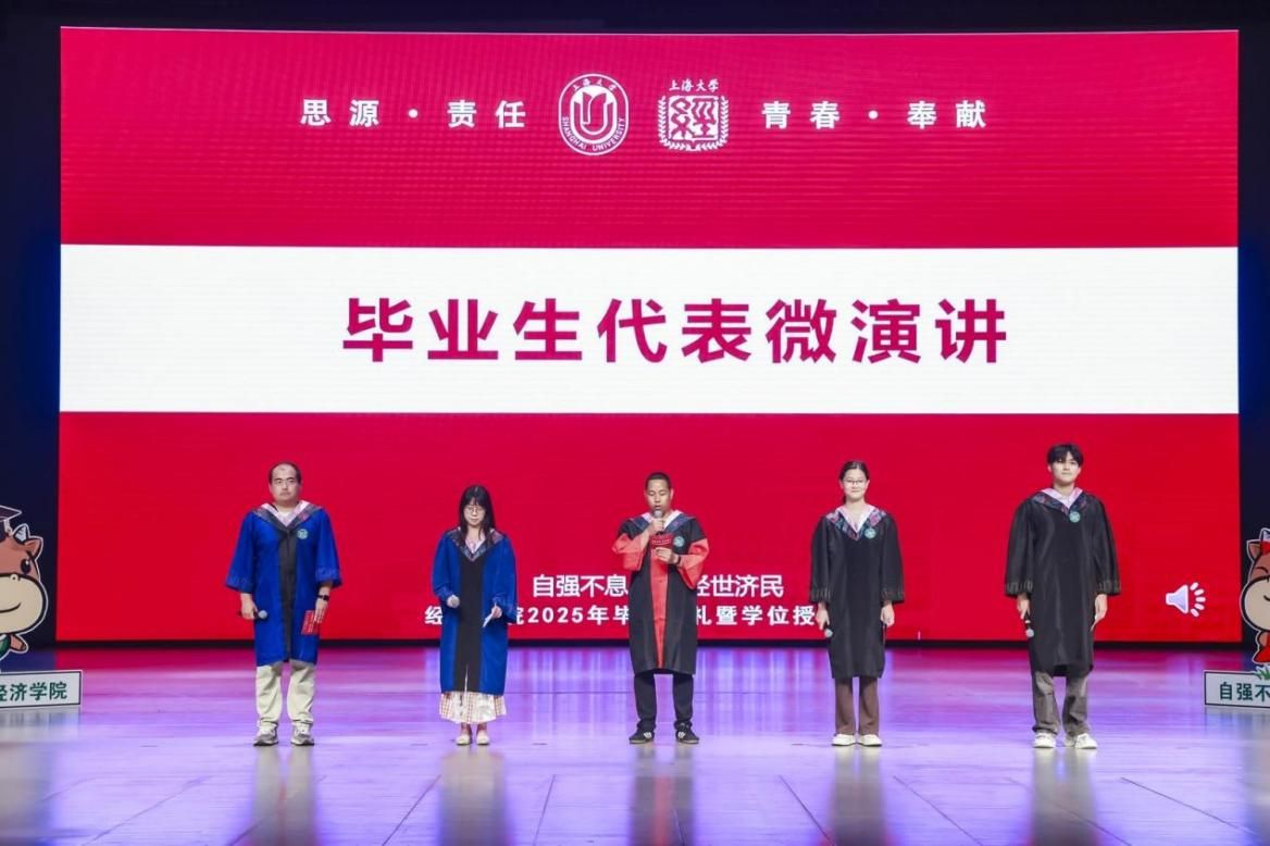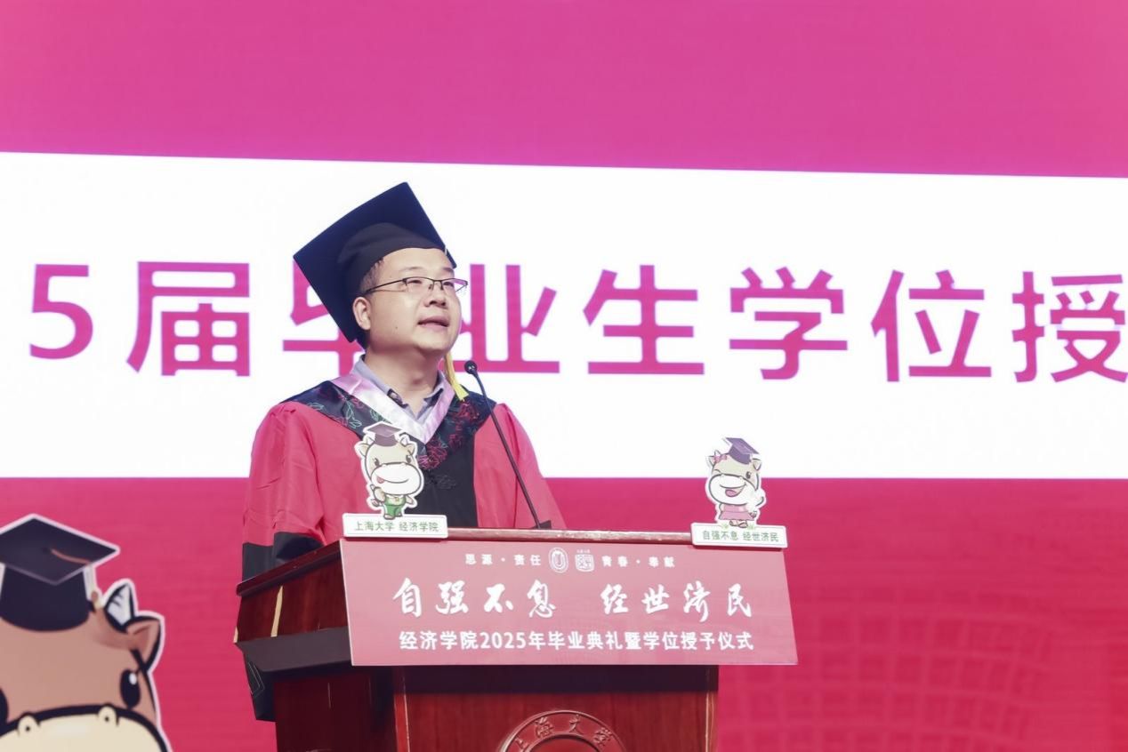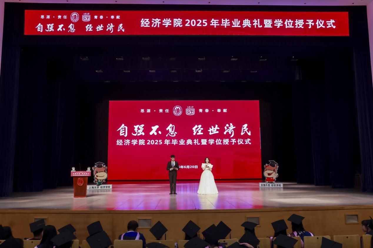 下午13时整,经济学院2025年毕业典礼暨学位授予仪式在宝山校区本部伟长楼举行。上海大学党委常委、副校长聂清,上海大学校董、经济学院特聘教授宋治平,经济学院党委书记尹应凯,党委副书记、常务副院长殷凤,党委副书记、副院长冯玉鑫,副院长毛雁冰,副院长、经济系主任刘康兵,副院长、产经中心副主任谭静,金融系主任王国松,经济系教工党支部书记卢正刚,金融系教工党支部书记刘建桥,金融系副主任许玲丽,宝山区发改委挂职副主任、经济学院教授赫赫,以及导师代表、校友代表、家长代表与全体毕业生齐聚一堂,共同见证这一庄重又温馨的时刻。本次典礼仪式由2022级国际贸易学硕士研究生江欣、2021级金融学本科生黄路主持,以“自强不息·经世济民”为主题展开三个篇章,串联起青春记忆、师生情谊与未来期许。