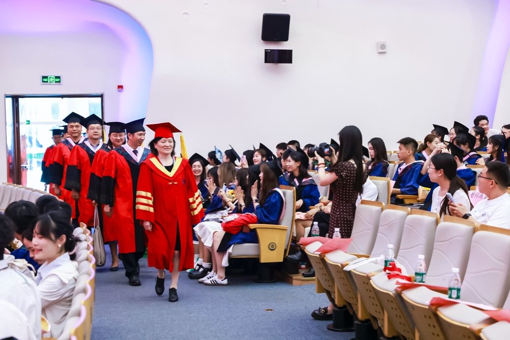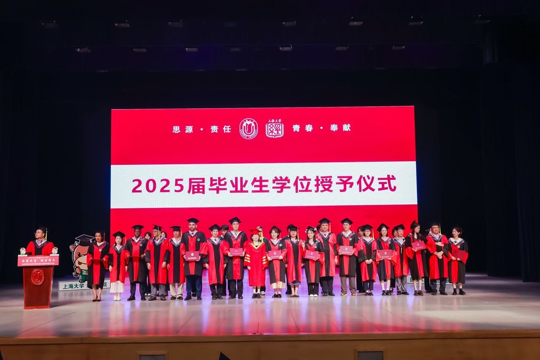 2025届毕业生学位授予仪式由党委副书记、副院长冯玉鑫主持,毕业生们依次走上舞台中央,主持人宣读出每一个毕业生的名字,上海大学党委常委、副校长聂清,院系领导及导师代表为他们拨穗正冠、颁发学位证书,合影留念。这一刻,所有的辛勤努力和付出都化作了脸上灿烂的笑容。毕业生们用坚定的步伐,迈向新的征程,展现了对未来的无限憧憬。各位领导在授予学位时,不忘与每位学生亲切交流,或叮咛嘱托,或微笑鼓励,现场氛围庄重而温馨。