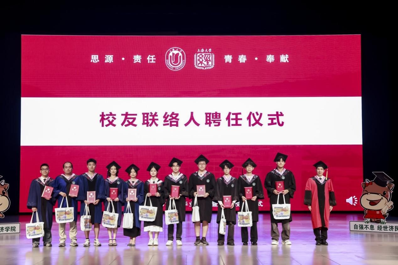 采访过后的校友联络人聘任仪式环节,经济学院党委书记尹应凯为2025 届毕业生代表颁发聘书,以毕业为起点,搭建起校友与学院的长效联结纽带。