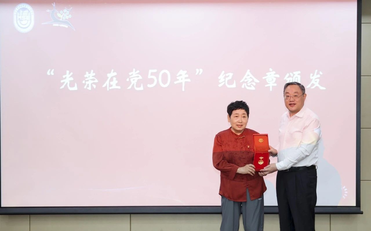 值此党的生日前夕,上海大学党委书记成旦红为陆翠兰老师佩戴上“光荣在党50年”纪念章。这枚沉甸甸的纪念章,是对陆老师半个世纪坚守信仰、为党育人、为国育才光辉历程的崇高礼赞。