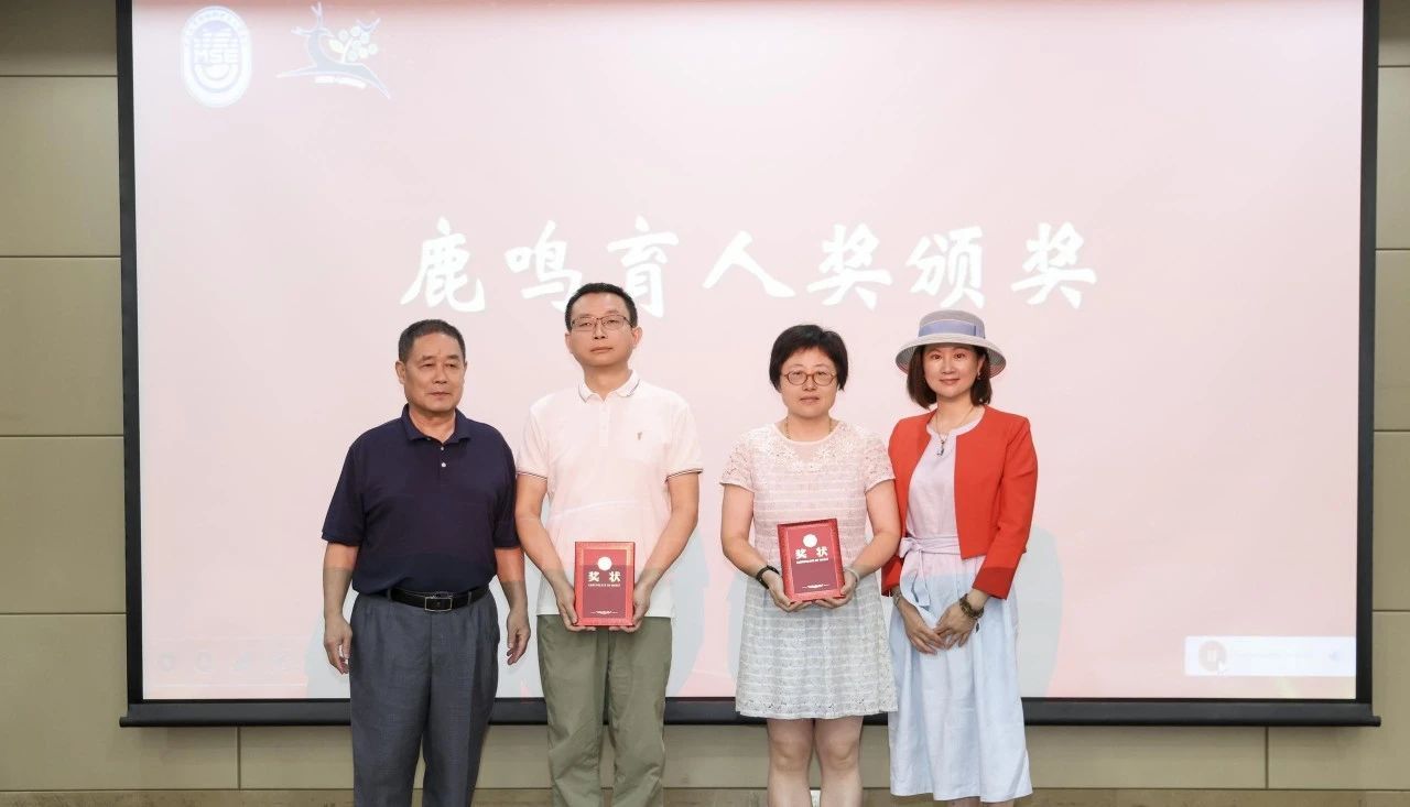 紧接着颁发第五届“鹿鸣育人奖”,两位获奖老师始终坚守育人初心,为学生成长成才搭建平台。陆翠兰老师的家人代表陆世斌先生和李沛话女士共同为两位颁奖。