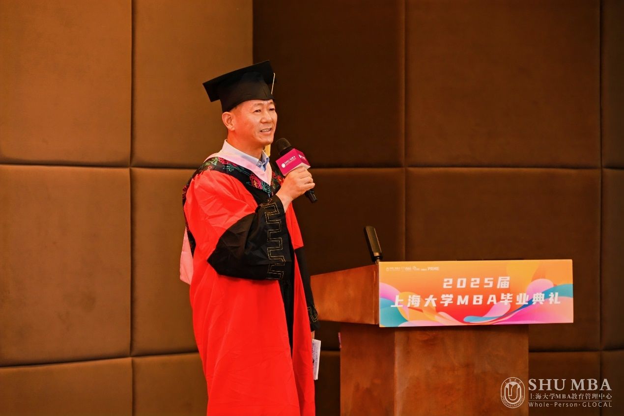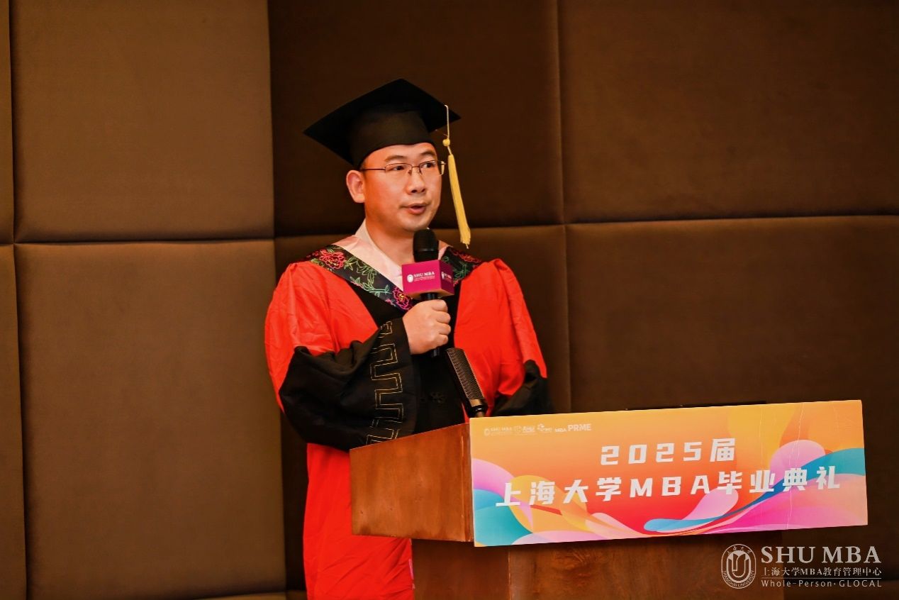 上海大学MBA中心主任、管理学院副院长于晓宇首先代表MBA中心全体教职员工向圆满完成学业的302名学子表示热烈的祝贺,并向辛勤培育他们的师长、默默支持他们的家人亲友表示衷心的感谢。接着,他引用了习近平总书记对新时代青年的期望和高等商科教育的使命,肯定了同学们在课堂、赛场和社会实践中的优异表现,以及他们在创新创业、社会责任等方面的突出成就。最后,他向同学们提出了三点嘱托: