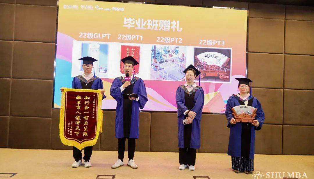 2025届毕业生们满怀感恩,各个班级特意准备了一份礼物,献给上海大学MBA中心。这份礼物是他们心意的凝聚,是对中心辛勤培育的真挚回馈。各个毕业班的代表上台,将这份承载着深情厚谊的礼物传递出去,为这段难忘的求学时光画上一个圆满的句号。