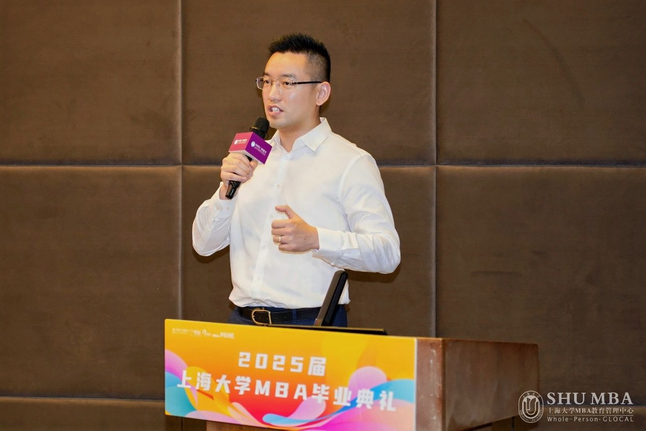 上海大学MBA中心2014级校友、上海礼多多电子商务有限公司创始人兼总经理易可昕学长作为校友代表发言。易可昕学长分享了自己在上大的学习经历和感受,强调了MBA中心提供的知识、视野,以及与业界知名人士交流的机会对个人成长的重要性。他提到通过参与BST全球商业学习之旅,结识了来自不同国家的朋友,以及与优秀老师和教授建立的深厚关系。同时,他鼓励学弟学妹们珍惜并利用上大的资源和平台,为未来的人生和职业发展打下坚实基础。
