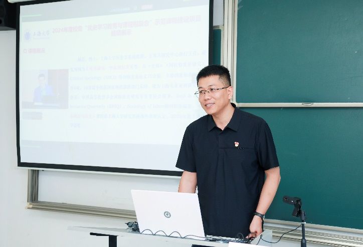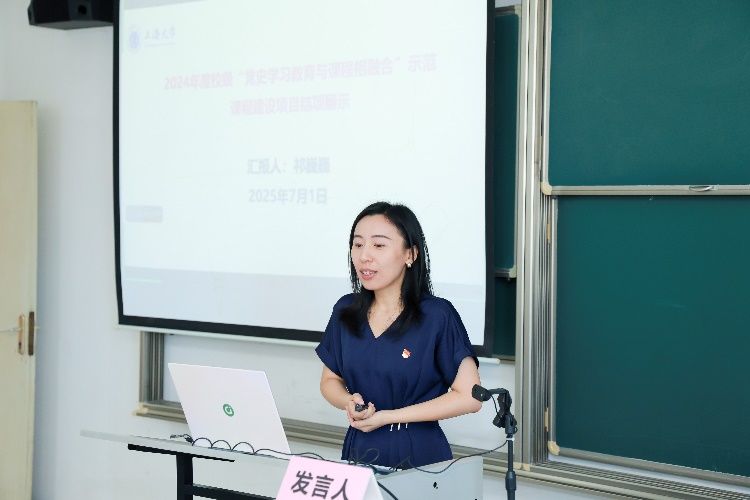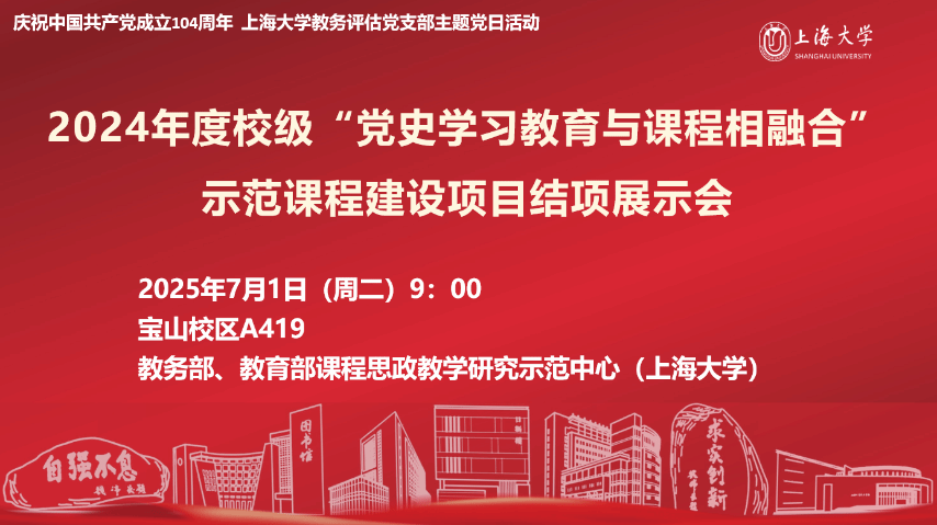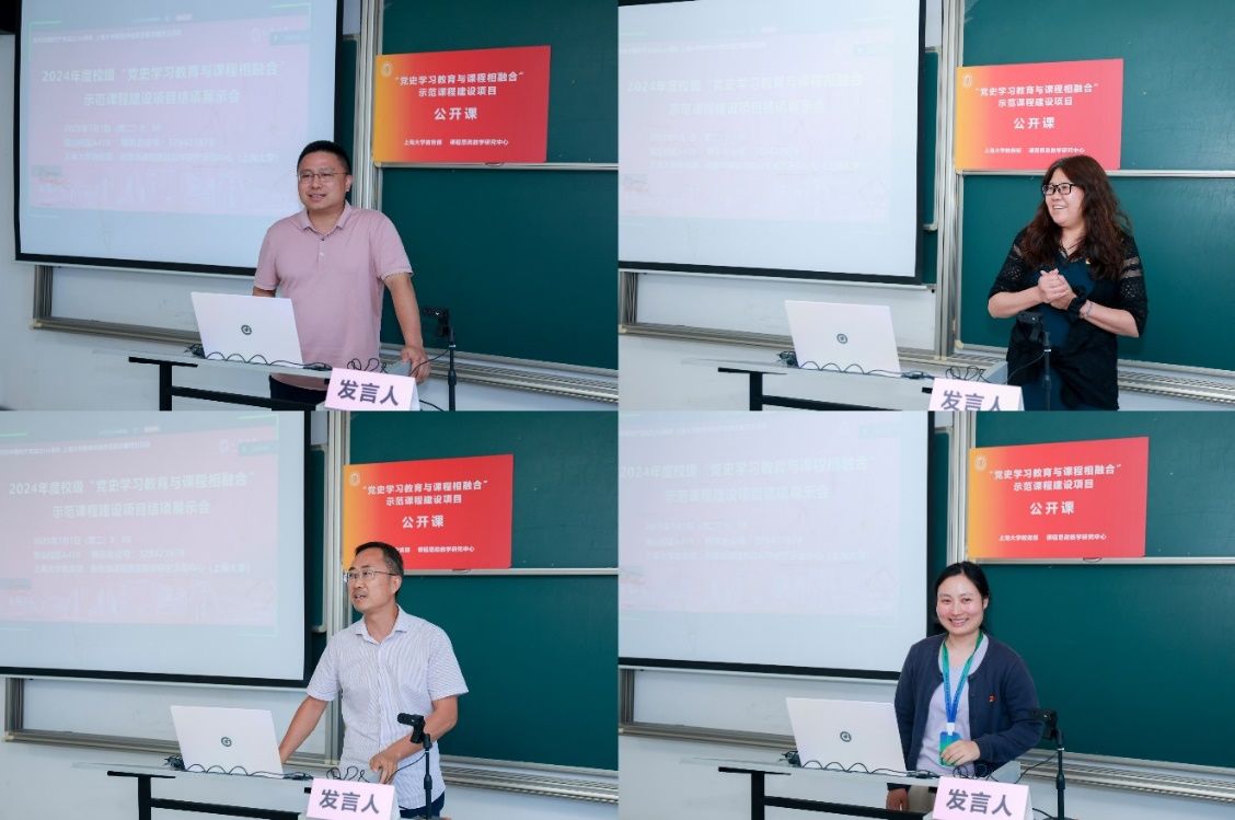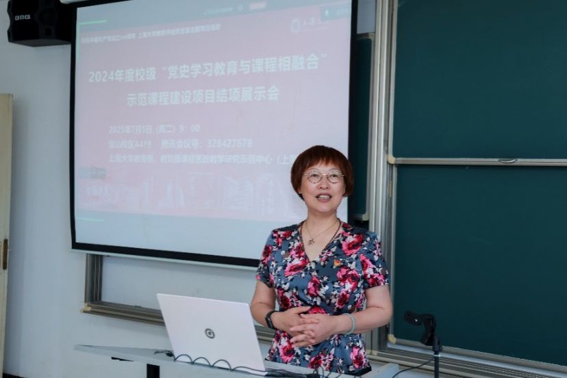 7月1日上午,上海大学2024年度“党史学习教育与课程相融合”示范课程建设项目结项展示会暨第20期全国高校党史类课程联盟共享课于宝山校区A419教室举行。在中国共产党成立104周年之际,本次会议同步作为上海大学教务评估党支部主题党日活动。结项展示会由上海大学教务部、教育部课程思政教学研究示范中心(上海大学)主办,采取线上线下相结合的方式召开,项目负责人、教务评估支部党员代表、课程思政名师工作主持人代表等30余人线下参会,来自井冈山大学、延安大学、安徽师范大学、淮南师范学院、南昌师范学院等党史类课程联盟校的教师代表线上参会。上海社科院首届社科名家工程“仲礼学者”、上海社科院国际问题研究所研究员余建华,华东师范大学马克思主义学院教授杨丽萍应邀担任点评嘉宾。教育部课程思政教学研究示范中心(上海大学)负责人、上海高校思政课名师工作室主持人、上海大学教务部副部长顾晓英担任主持。