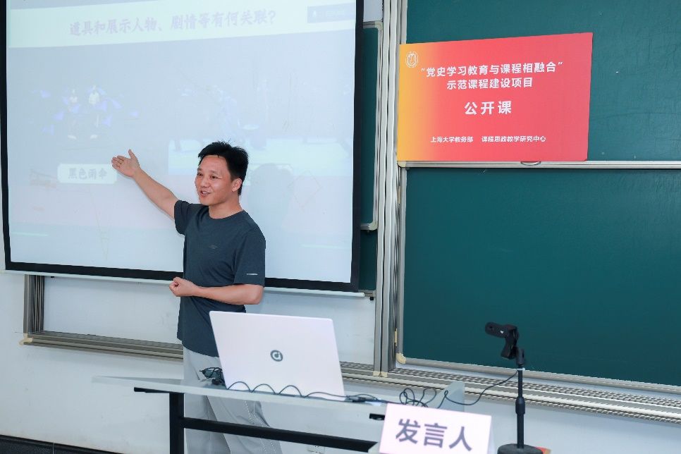 上海大学音乐学院还国志老师以“信仰永存、红色舞蹈文化的解码与创新表达”为主题,结合舞剧《永不消逝的电波》开展党史融入课程的公开课说课教学。他引导学生从肢体语言、服饰、道具、舞美、音乐等多维度分析,强调《永不消逝的电波》舞剧承载着精神传递与历史印记,引导学生深刻领悟传承红色基因,感悟中国共产党人践行的初心使命。