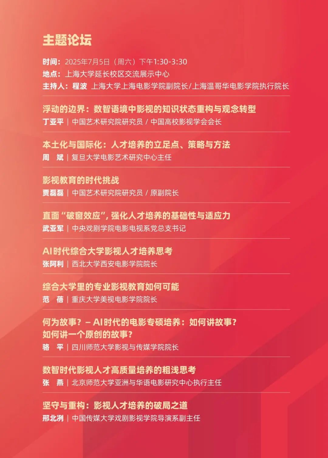 7月5日,“AI时代影视创制人才培养创新策略与未来趋势——国际影视创制人才培养教育论坛”在上海大学延长校区交流展示中心成功举办,论坛旨在深入探讨AI时代国际影视人才培养现状及未来趋势,推动国际影视人才教育深入发展。此次论坛分为主旨发言和主题论坛两大板块,十余位来自国内外兄弟学校及科研院所的著名专家围绕论坛主题各抒己见,分享了在数智时代影视人才培养的新模式、电影教育的重新思辨、影视的知识状态重构与观念转型、影视教育的时代挑战等方面的前沿探索与实践经验。