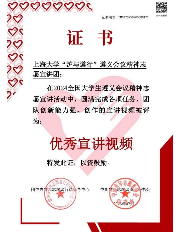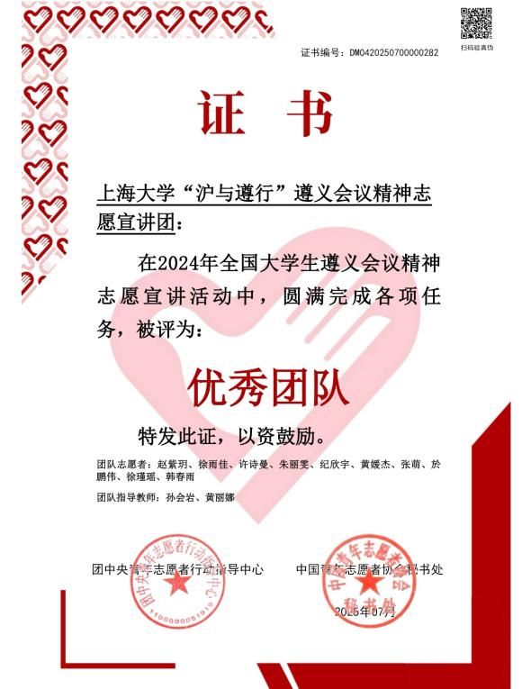 2025年是遵义会议召开90周年,为深入贯彻落实习近平总书记提出的“传承红色基因、讲好遵义故事”的重要指示,落实“强国复兴有我”群众性主题宣传教育活动相关要求,团中央青年志愿者行动指导中心、中共遵义市委、共青团贵州省委于2024年下半年联合发布了《关于遴选2024年全国大学生遵义会议精神志愿宣讲团的公告》。由上海大学马克思主义学院团委指导的上海大学“沪与遵行”遵义会议精神志愿宣讲团光荣入选,经过为期半年的志愿宣讲,日前已顺利结项,并经材料审核、全国遴选、评审等环节,荣获“优秀团队”“优秀宣讲视频”两项集体荣誉。