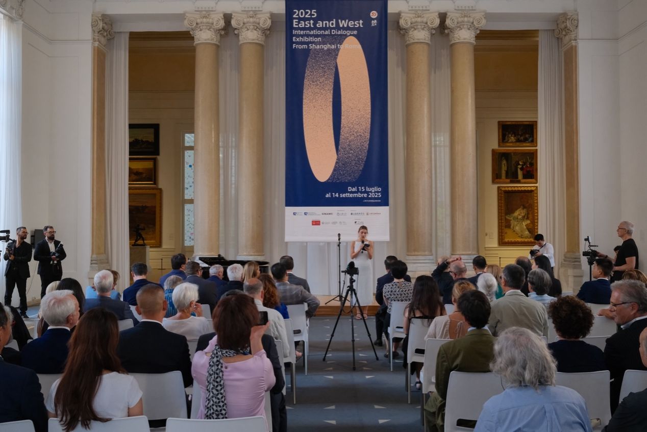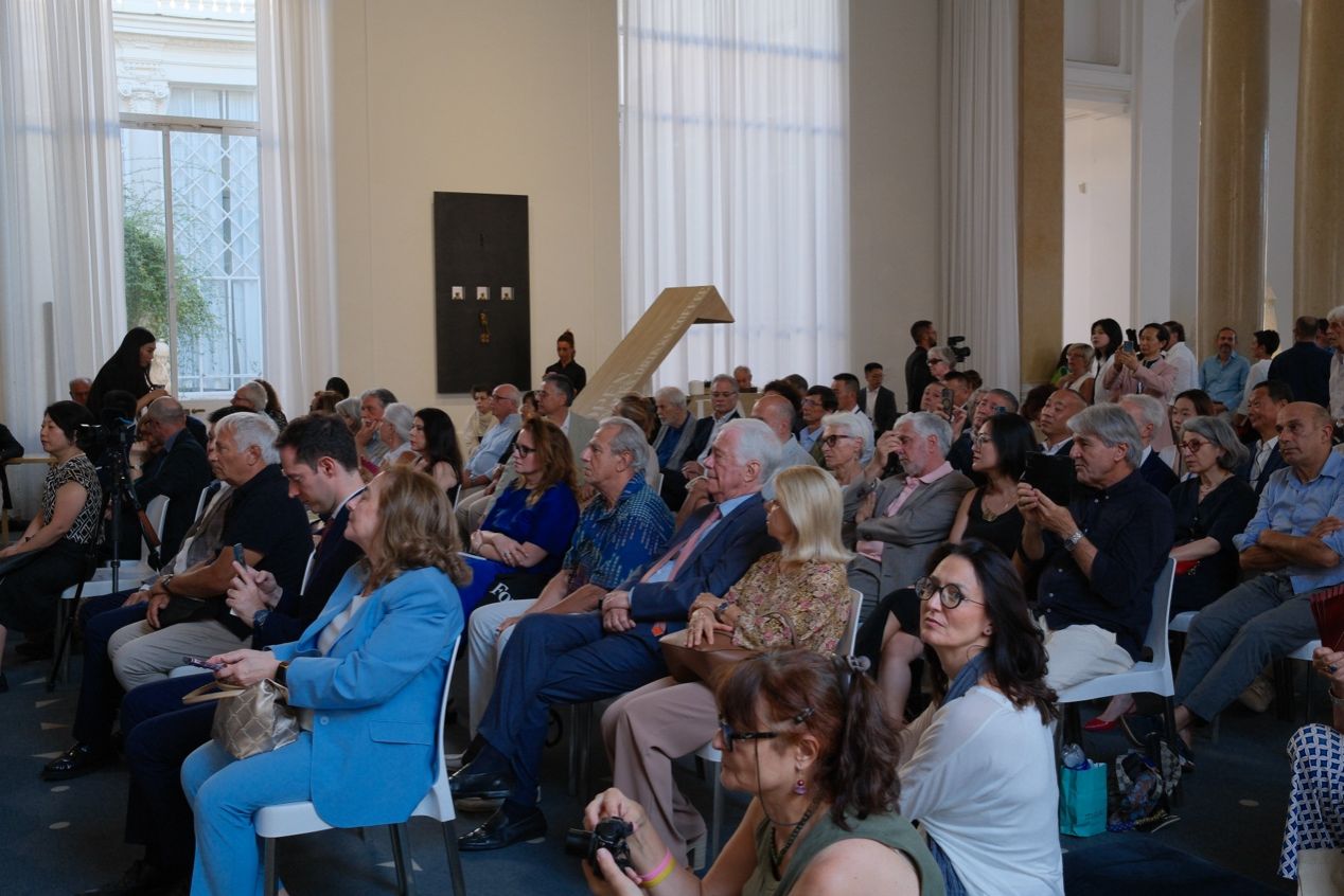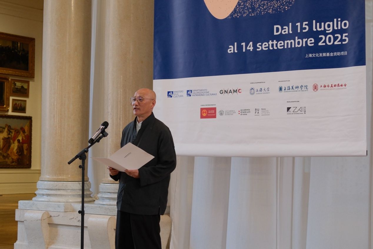 当地时间7月14日晚,意大利国家现当代美术馆灯光璀璨、嘉宾云集。由上海大学指导,上海大学上海美术学院、意大利国家现当代美术馆、上海市美术家协会联合主办,中华人民共和国驻意大利大使馆、意大利文化部、罗马艺术大学、罗马美术学院、佛罗伦萨美术学院等机构荣誉支持,上海文化发展基金赞助的“2025无问西东国际对话展:从上海到罗马”隆重开幕。中意两国艺术家、文化学者与政界嘉宾齐聚一堂,共同见证这场跨越时空与文明的艺术对话。