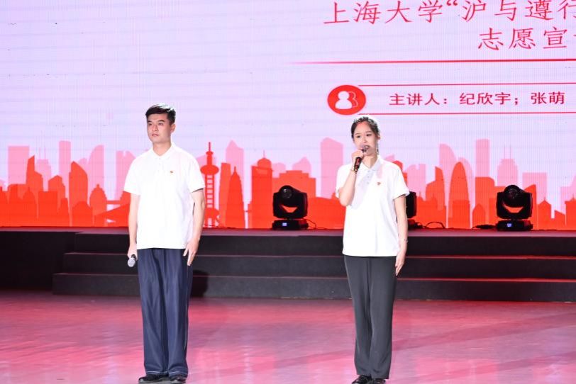 展演中,纪欣宇、张萌以《沪遵同行,山海共情:让遵义会议精神永放光芒!》为题,通过详实的史料梳理、生动的故事讲述和真挚的情感表达,向全场观众展现了上海与遵义两地因红色血脉结下的深厚情谊,让观众深刻感受到两地“山河共频”的协作精神。