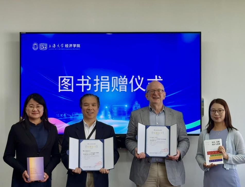 讲座结束后,在经济学院567会议室举行了图书捐赠仪式。哈达斯教授与译者周振雄先生向上海大学图书馆、上海大学经济学院捐赠《货币、金融、现实与道德》原版著作及中文译著,经济学院常务副院长殷凤教授、金融系副主任朱欢老师为哈达斯教授与译者周振雄先生颁发收藏证书。