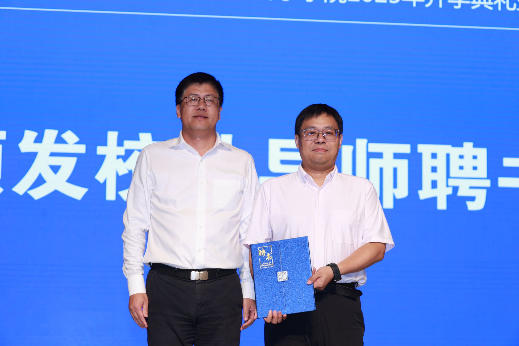 紧接着,本科生全程导师聘书颁发环节启动。学院党委书记朱宏涛为庞盛业、李江涛、许华虎三位教师颁发本科生全程导师聘书。许华虎作为本科生全程导师代表发言。他结合钱伟长老校长“拆除四堵墙”的教育理念,希望同学们积极参与全程导师活动,始终保持思考创新、坚韧不拔、协作共赢的状态,收获交叉学习等重要技能。