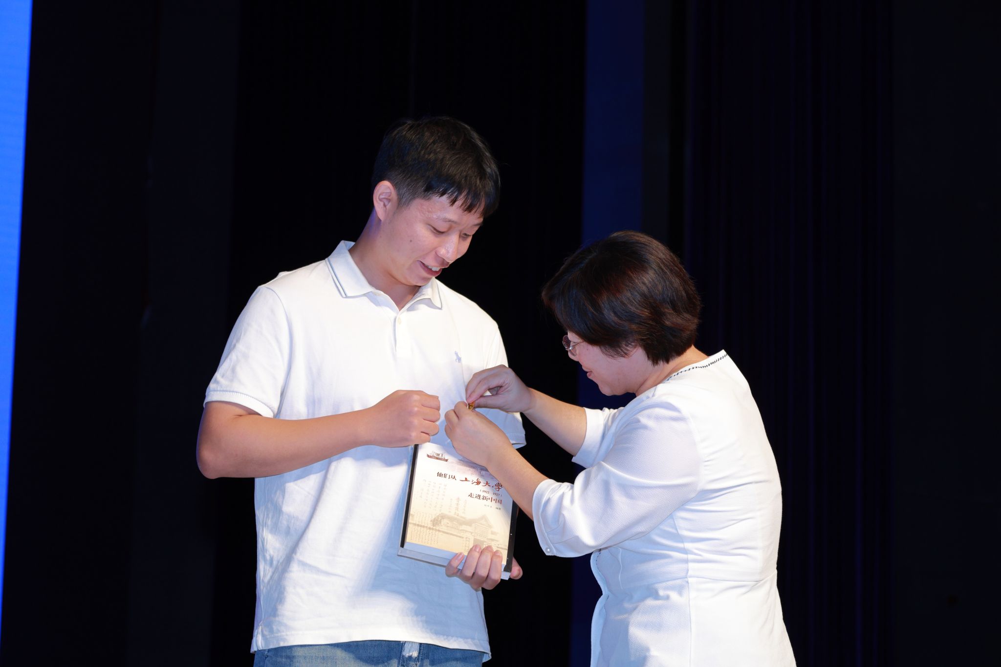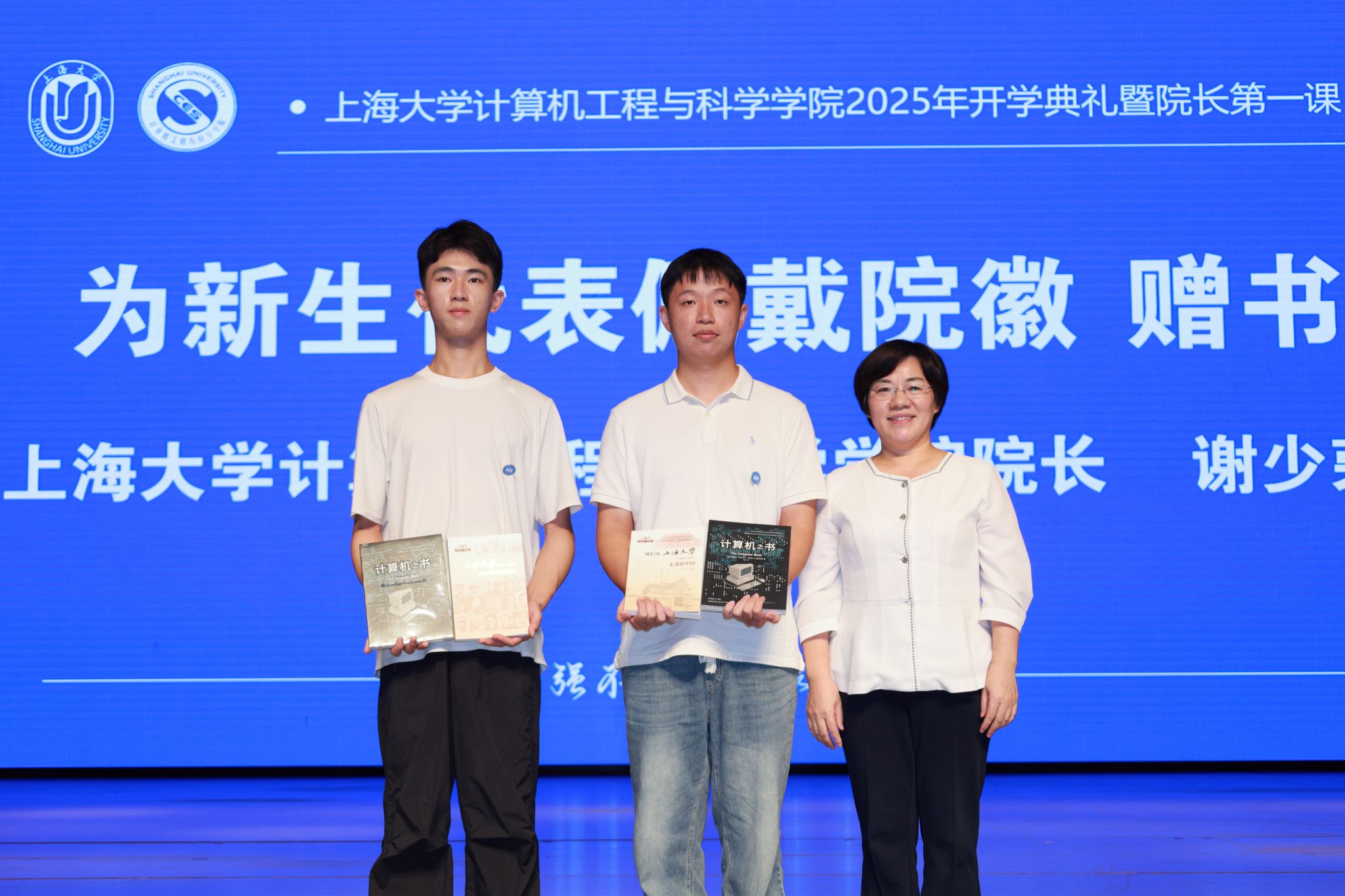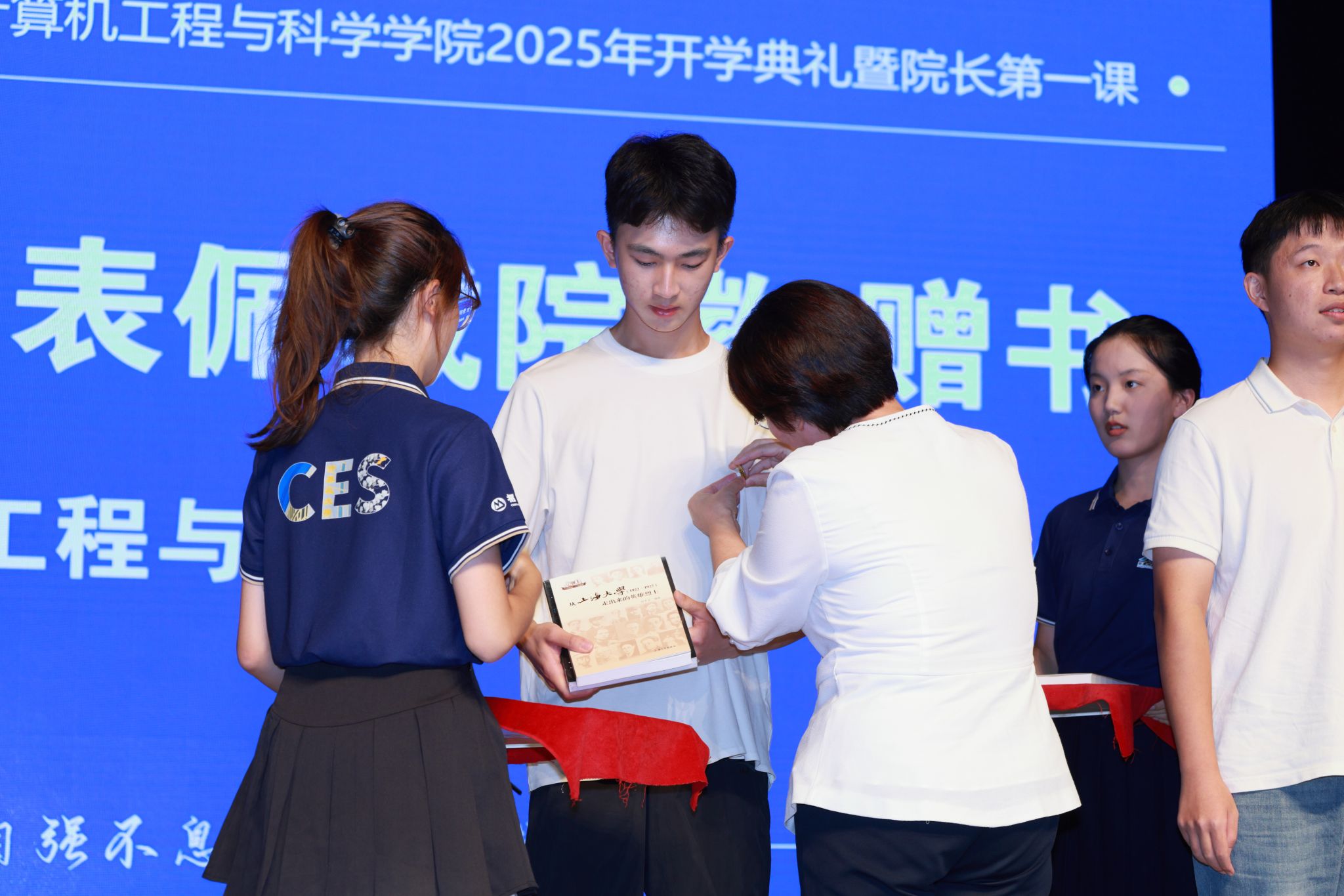 接着典礼的温馨时刻来临——院长谢少荣为新生代表佩戴院徽、赠送书籍。当闪耀着学院标识的院徽被别在新生胸前时,现场掌声响起,这枚小小的院徽不仅是身份的象征,更承载着学院的期望与传承;随后,谢院长将精心挑选的书籍递到新生手中,为新生们送上了最诚挚的开学祝福。