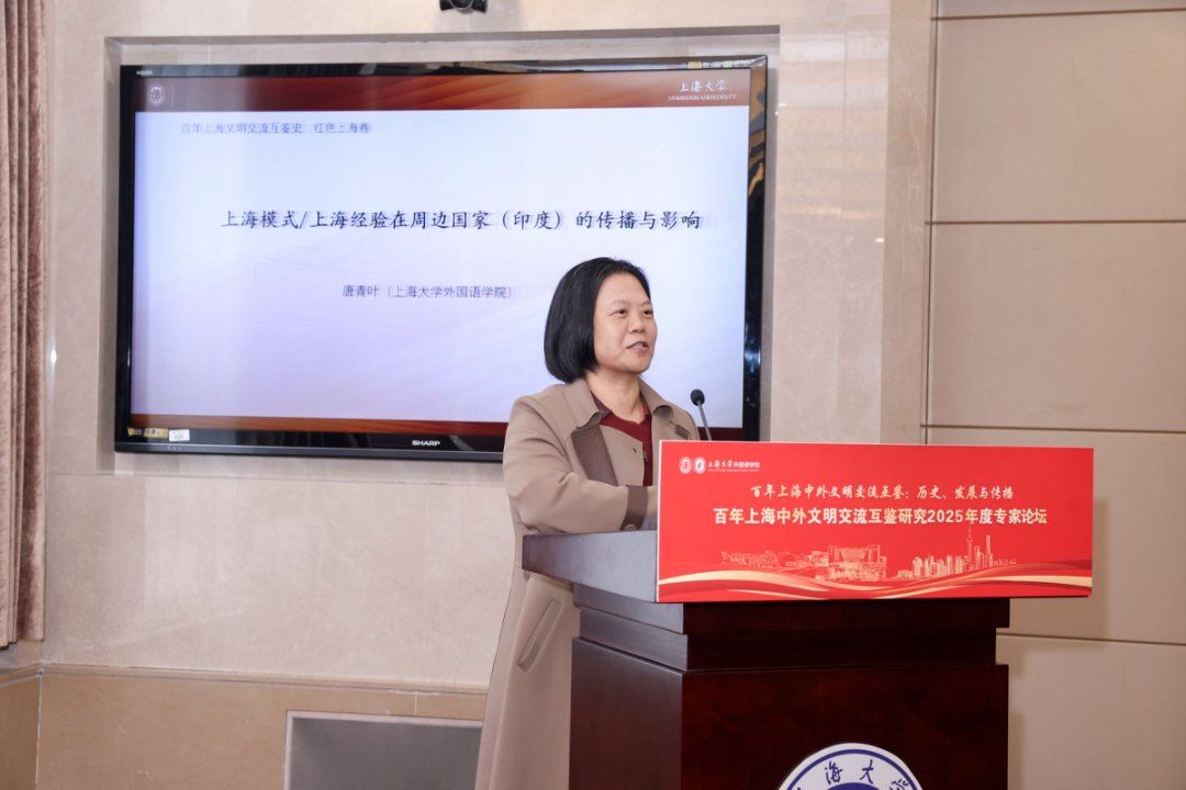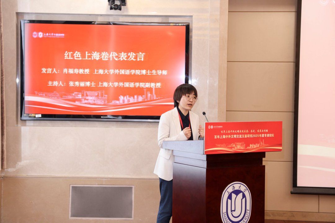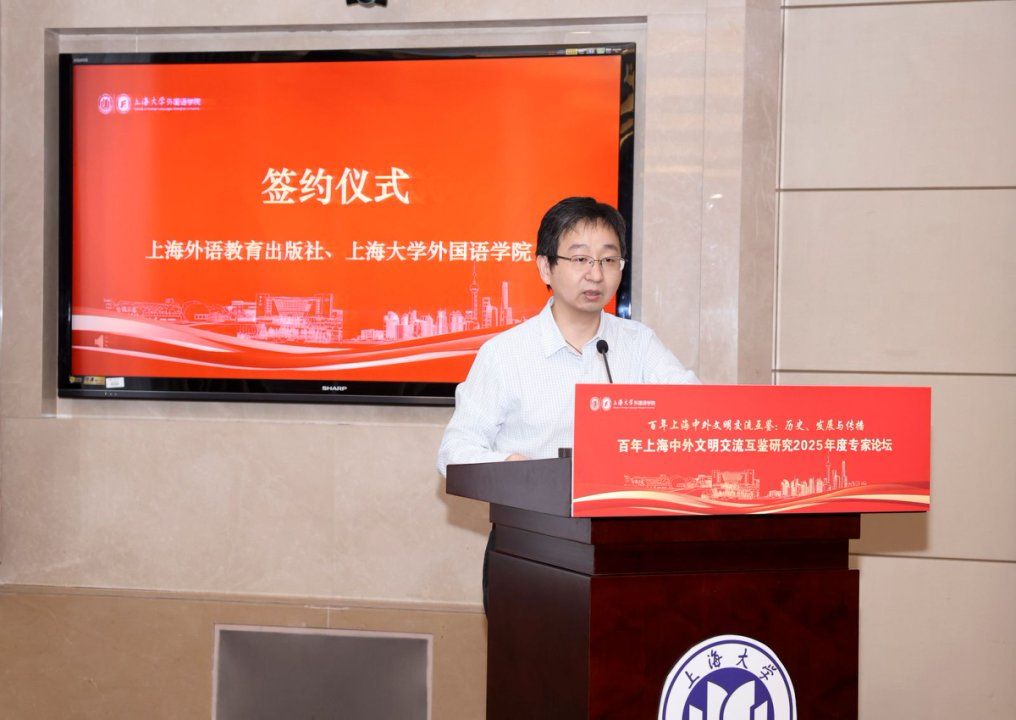秋日泮池,碧波荡漾,思想交融。10月18日,上海大学外国语学院在上海大学宝山校区乐乎新楼学海厅举行“百年上海中外文明交流互鉴:历史、发展与传播——百年上海中外文明交流互鉴研究2025年度专家论坛”,本次论坛由上海外语教育出版社、上海市外文协会协办。第十三届、十四届全国政协常委、西安外国语大学原校长户思社教授,上海外语教育出版社社长助理高云松,上海外语教育出版社田慧肖、杨洋,西安外国语大学齐赵园、朱维嘉,华东理工大学陈丽、何玮,上海海事大学郭海霞、张宏雨、莫为,上海外国语大学张彩迪,河南安阳工学院郭欣,山东科技大学伊丹丹,上海大学刘娇蕾等校内外学者,学院党政领导班子及师生代表等出席此次会议。