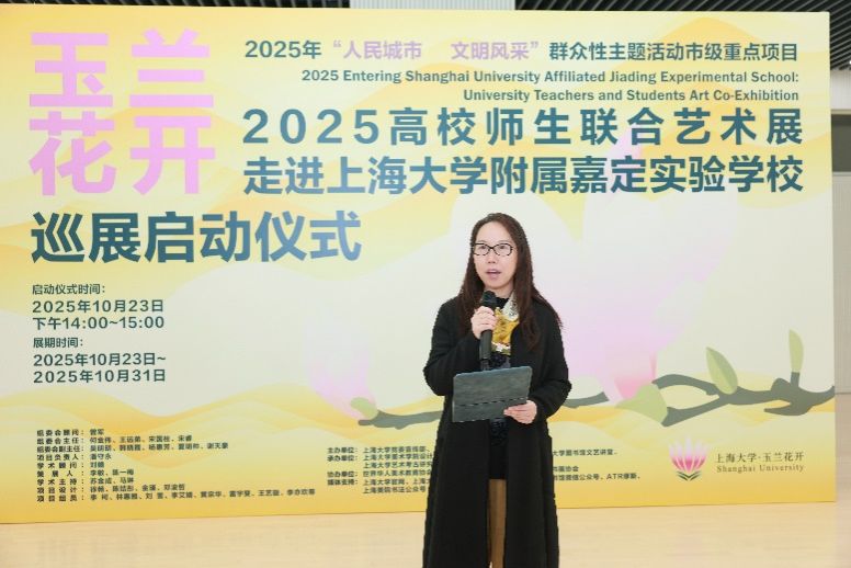 赠书仪式后,策展人、上海大学上海美术学院李敏教授以诗意的语言,为在场师生揭开了本次展览的神秘面纱。她从玉兰的清雅品格说到海派文化的独特气质,从高校艺术精品谈到数字美育的创新实践。在她的生动描述中,一幅融汇传统与现代、交织高校与基础教育的美丽画卷缓缓展开。