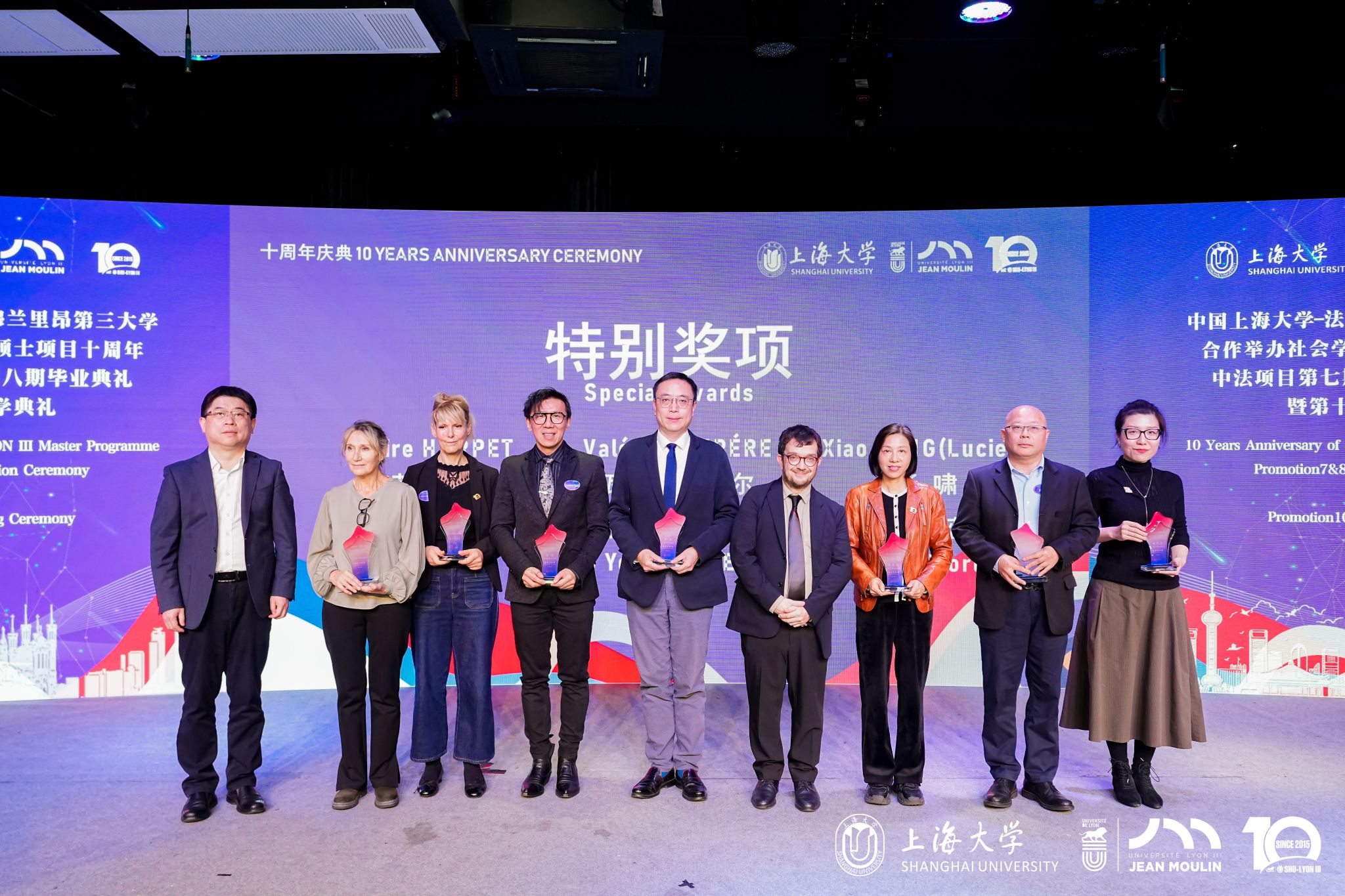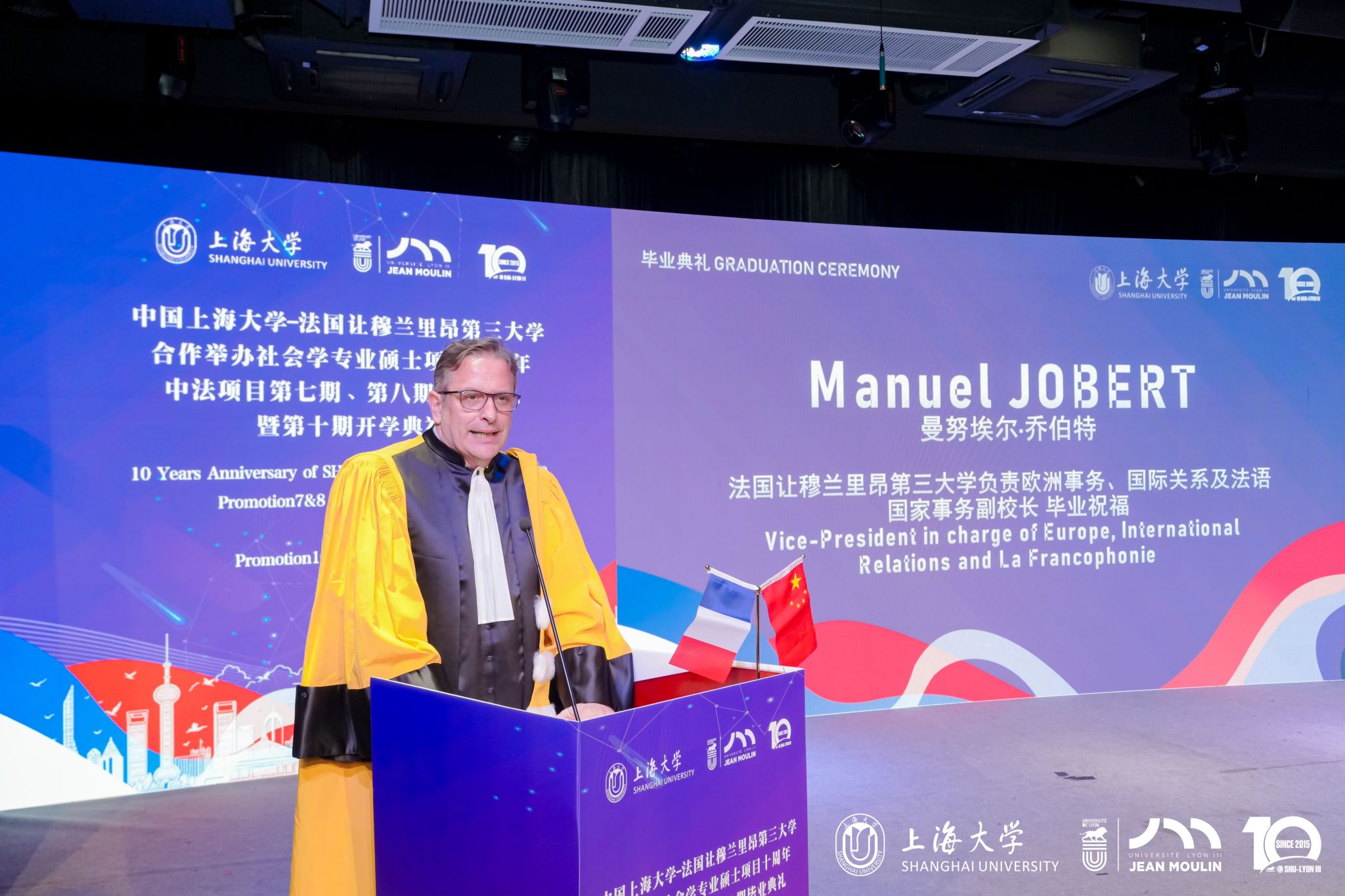 在中法建交61周年之际,上海大学与法国让穆兰里昂第三大学合作举办的社会学专业硕士项目迎来十周年里程碑。11月16日上午,项目十周年庆典活动暨第七、八期毕业典礼、第十期开学典礼在上海大学延长校区第四教学楼举行。法国驻上海总领事馆总领事Joan VALADOU(王度),法国驻上海总领事馆高等教育项目官员Carla HAID(爱可兰),法国让穆兰里昂第三大学校长Gilles BONNET,里昂三大负责校委会事务副校长Marc BONICHI,里昂三大负责欧洲事务、国际关系及法语国家事务副校长Manuel JOBERT,里昂三大哲学院院长Mikaël COZIC,里昂三大中法项目联合主任Claire HARPET,里昂三大国际关系部-国际合作办学项目行政主任Valérie TEMPÉRE,里昂三大国际关系部-亚洲合作事务行政主任、法语国家事务亚洲项目负责人Xiao YANG(Lucien),里昂三大国际关系部-法语国家事务项目负责人(前法国驻北京大使馆教育官员)Celia HOARAU,上海教育评估协会跨境教育专委会常务副主任汪建华,上海大学国际部党委副书记、副部长、国际合作处处长崔巍,上海大学上海经济管理中心主任朱明原,上海大学中法项目联合主任孟添以及项目授课老师、论文导师代表、项目第七、八期毕业生、第十期新生、部分校友代表出席活动。