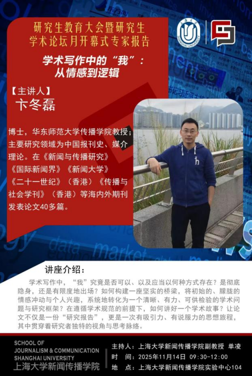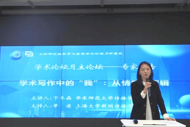 上海大学新闻传播学院第一次研究生教育大会暨第四届研究生学术论坛月开幕式后,随即举行了本届学术论坛月主论坛专家讲座。讲座由上海大学新闻传播学院单凌老师主持,华东师范大学传播学院卞冬磊教授分享了题为《学术写作中的“我”:从情感到逻辑》的专题报告。