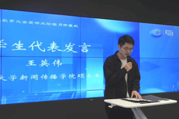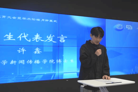 上海大学新闻传播学院博士生许鑫和硕士生王英伟作为学生代表发言。博士生代表许鑫在发言中感谢学院为学子搭建学术交流平台,他表示学术论坛月是一场思想碰撞的盛宴,鼓励大家在媒介变革时代,既要追求研究方法与理论视野的精进,也要秉持人文关怀与家国情怀,勇于面对真问题、发出新声音。硕士生代表王英伟结合自身科研经历分享三点体会:一是论文是“改出来”的,审稿意见是打磨思想的砂纸;二是面对拒稿应保持平常心,将其视为学术共同体的“体检报告”;三是学术虽孤独,但交流能带来回响。他鼓励同学们珍惜论坛平台,勇敢展示思考,在碰撞中激发灵感,在坚持中厚积薄发。